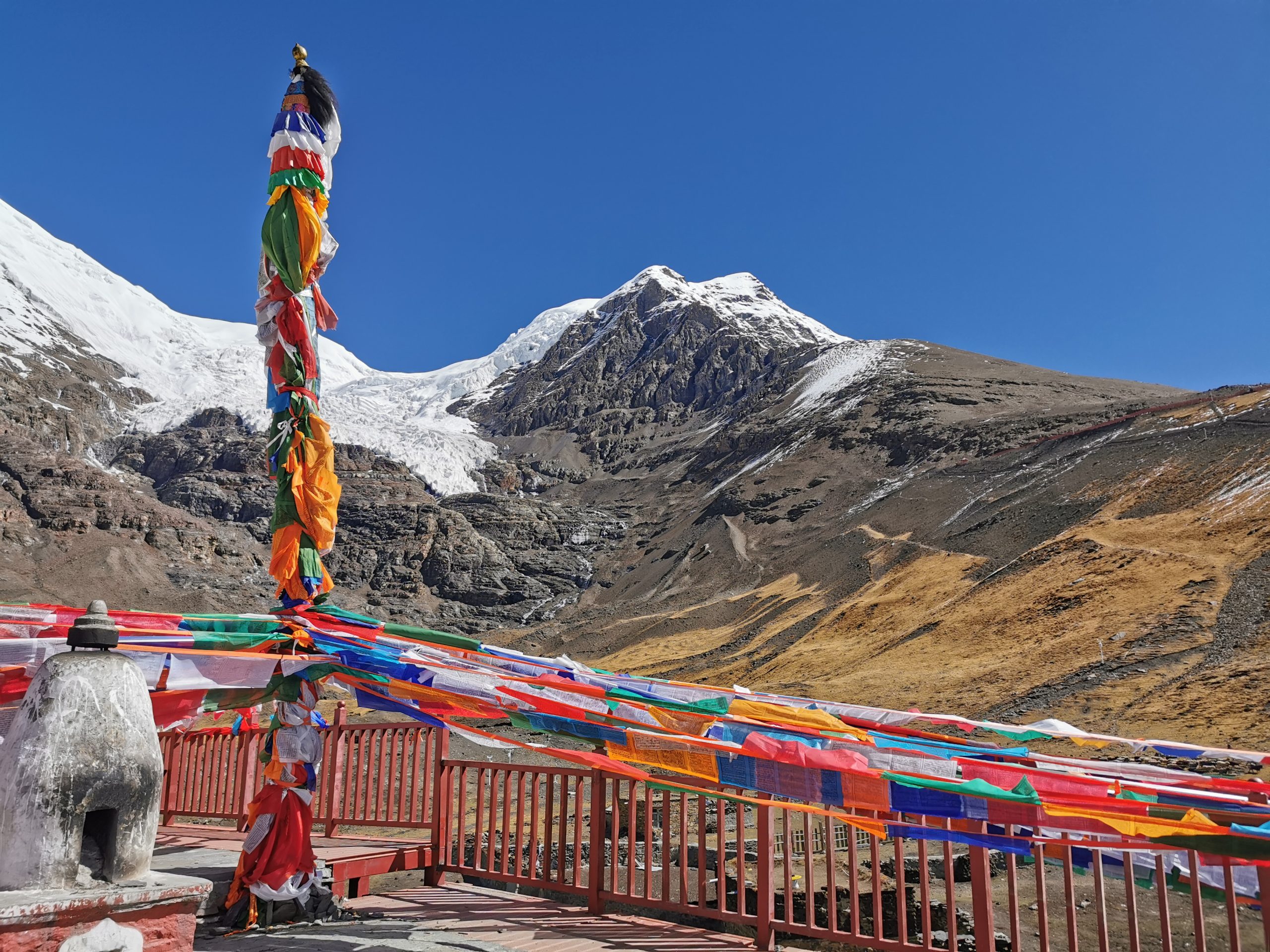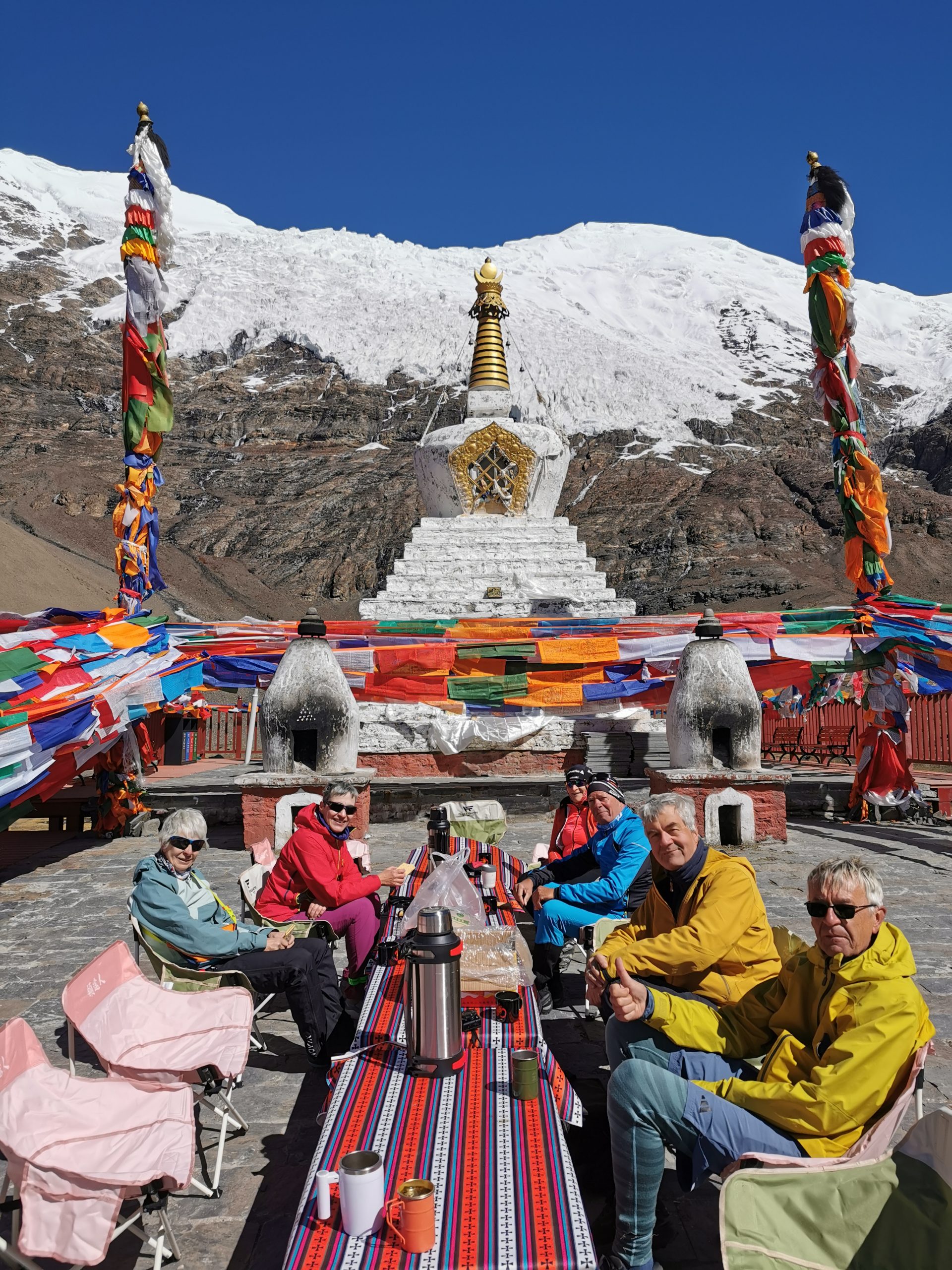 Wäre es nicht um den nach gut zehn Kilometer aufkommenden Gegenwind, der zunehmend an Stärke gewinnt, dann würde sich der Weg hinauf zum 5039 Meter hohen Karo La fast wie ein Kinderspiel anfühlen. Unsere Panosonic-Motoren surren (im Übrigen kaum hörbar – kleiner Gruß an die Kollegen von Bosch!) zuverlässig den Pass hoch, den wir kurz vor Mittag erreichen. Wir fahren ein kleines Stück Schuss bergab und machen dann Picknick an einer Stupa direkt unter dem Karo-La-Gletscher. Picknick auf genau 5000 Meter Höhe – ein Traum!