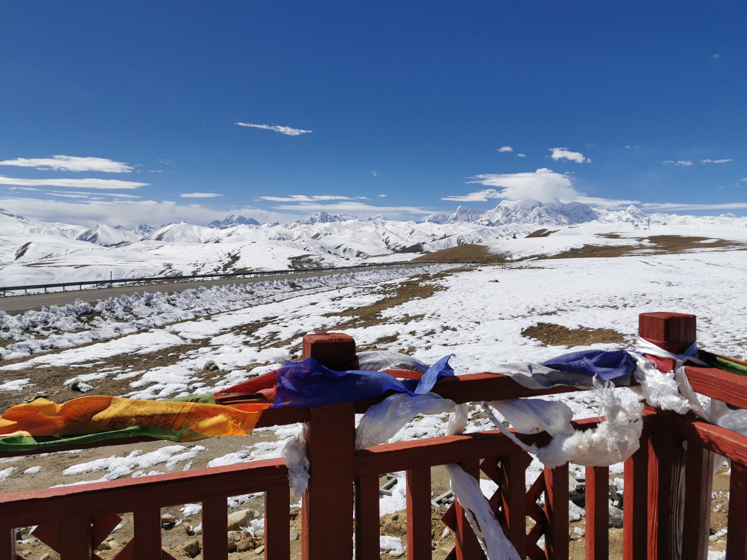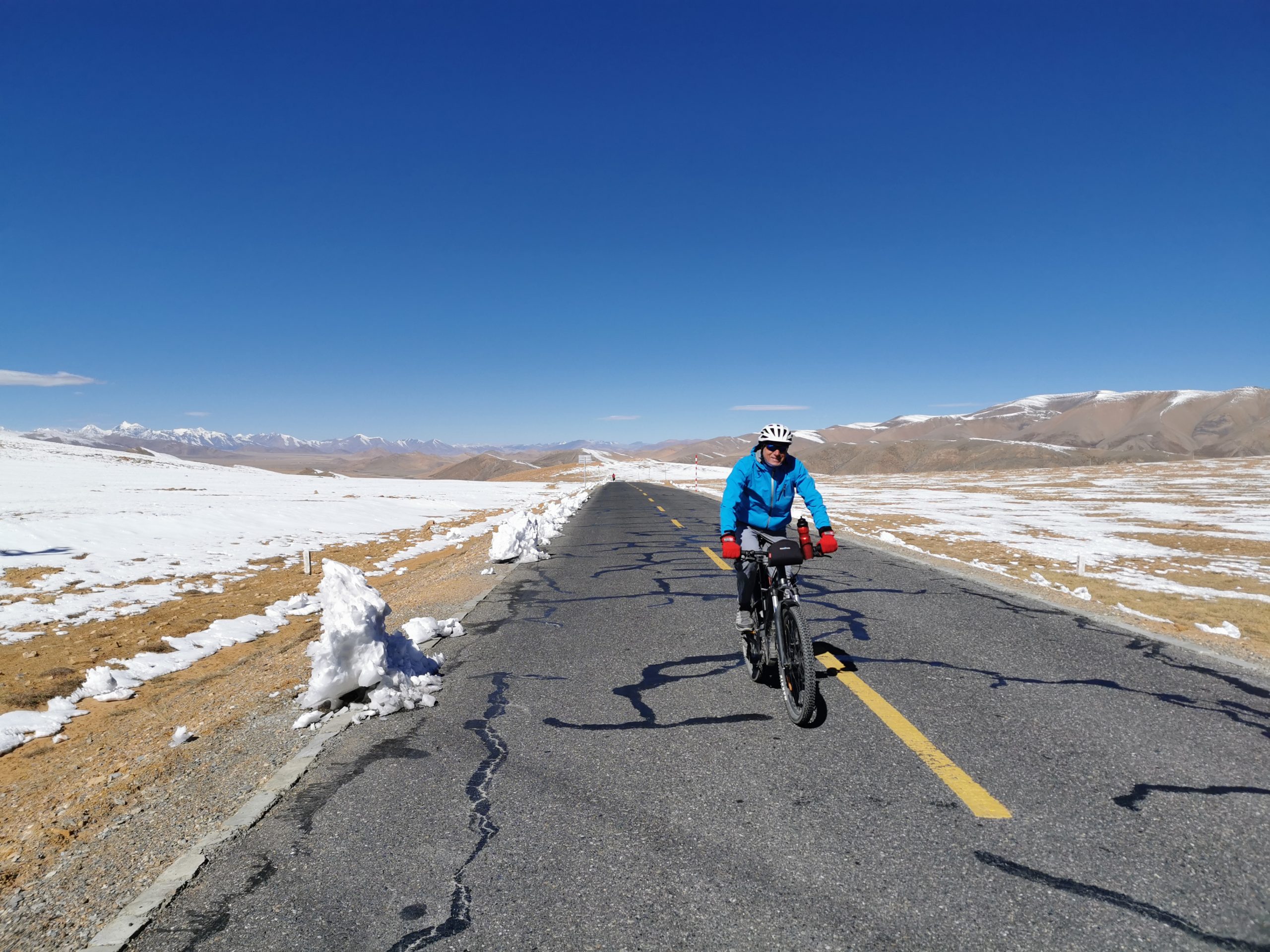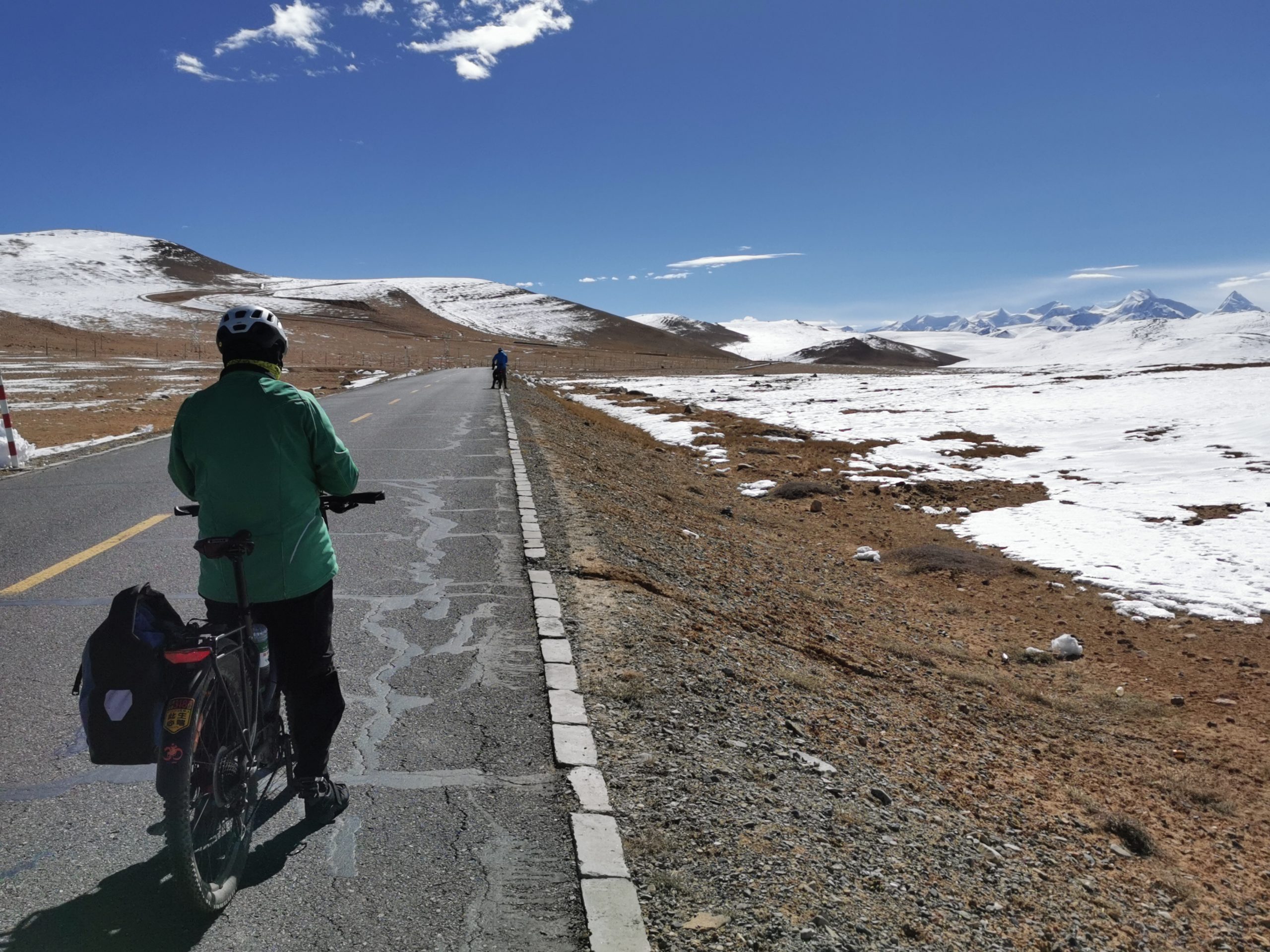 Vor die längeste Abfahrt der Welt hat Buddha aber erst die gefühlt längste Steigung gesetzt. Den ersten (und damit unseren vorletzten) Fünftausender nehmen wir noch mit Hurra, dann geht es ein wenig Schuss bergab (Gruß an den Shishipangma, der sich zur rechten nur leicht wolkenumhüllt vor uns aufbaut), eine kleine Teepause, bevor es dann an den finalen Aufstieg geht. Eine langgezogene Rampe, die dann einen langen Bogen nach rechts macht. Auf der Rampe steht der Gegenwind, und nach ein paar Kilometern schalten auch die Puristen unter uns in die höchste Unterstützungsstufe.