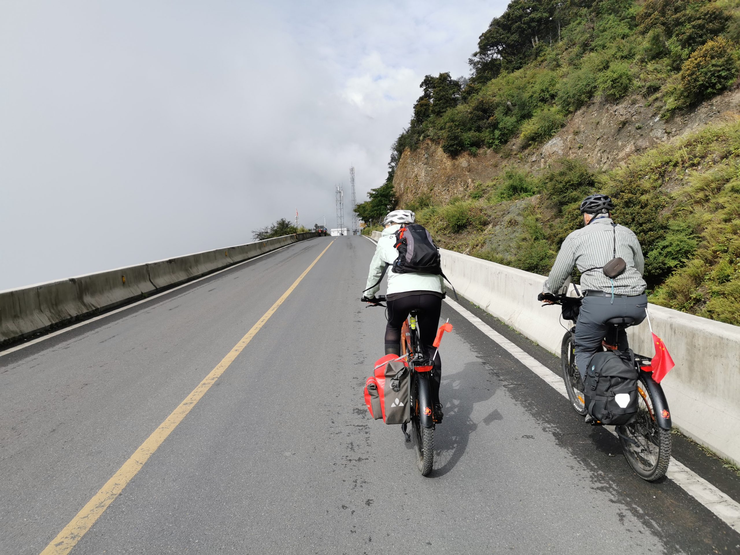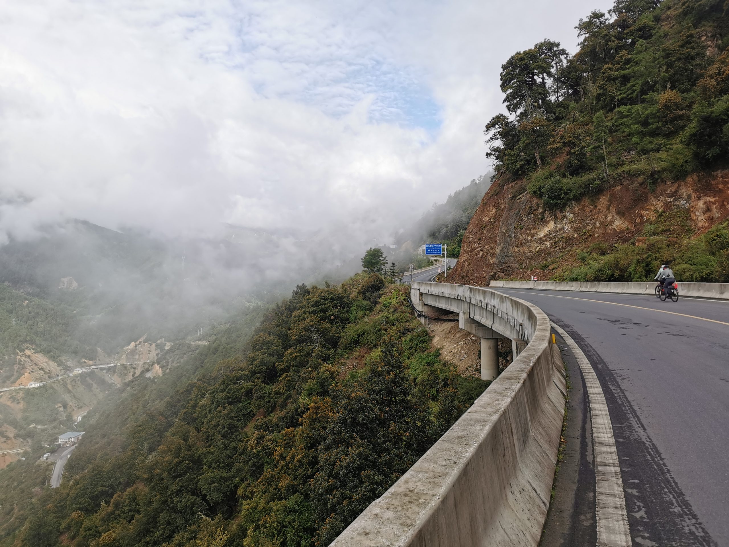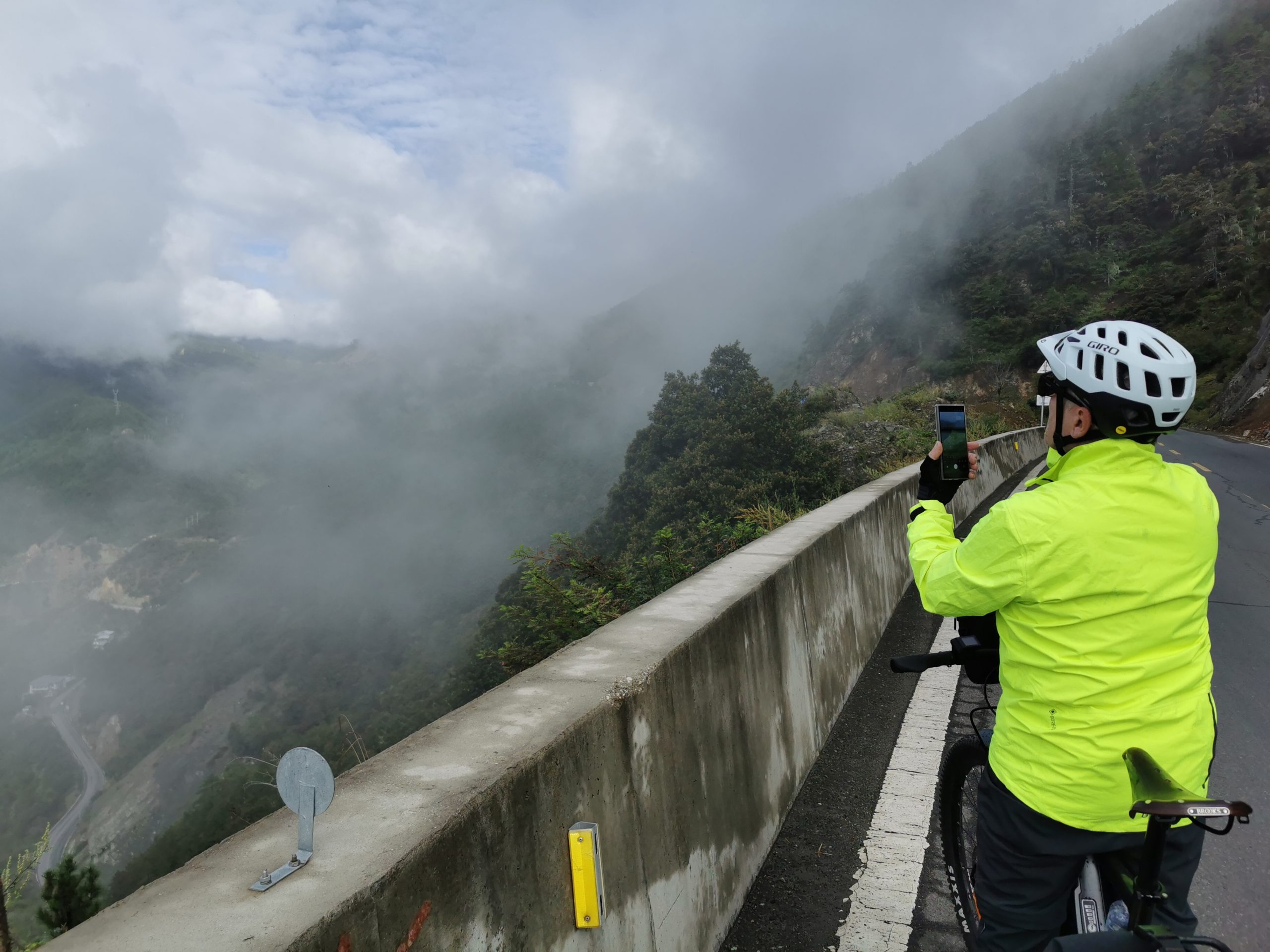 Der Morgennebel zieht die steilen Hänge hoch, mal ist der Blick ins Tal frei, mal zeigen sich die Berge. Andächtig radeln wir langsam die Serpentinen hoch, bis uns ein mobiler Kaffeestand zu einer Pause zwingt. Exzellenter Espresso Macchiato auf 3.500 Metern Höhe mit Blick ins Tal, wo hat man das schon! (Und wenn ja, sitzt man da kurzärmlich und -hosig ohne zu frieren?)