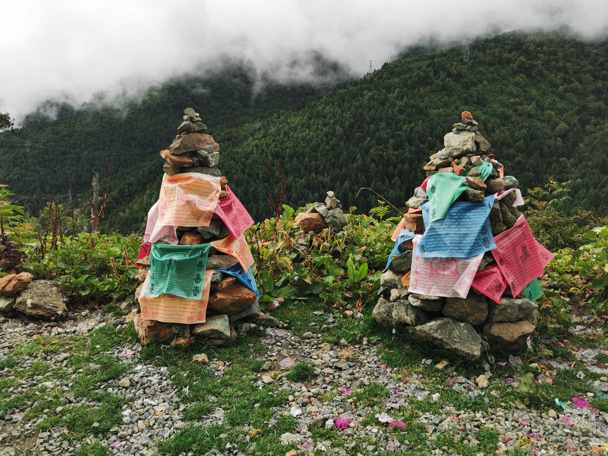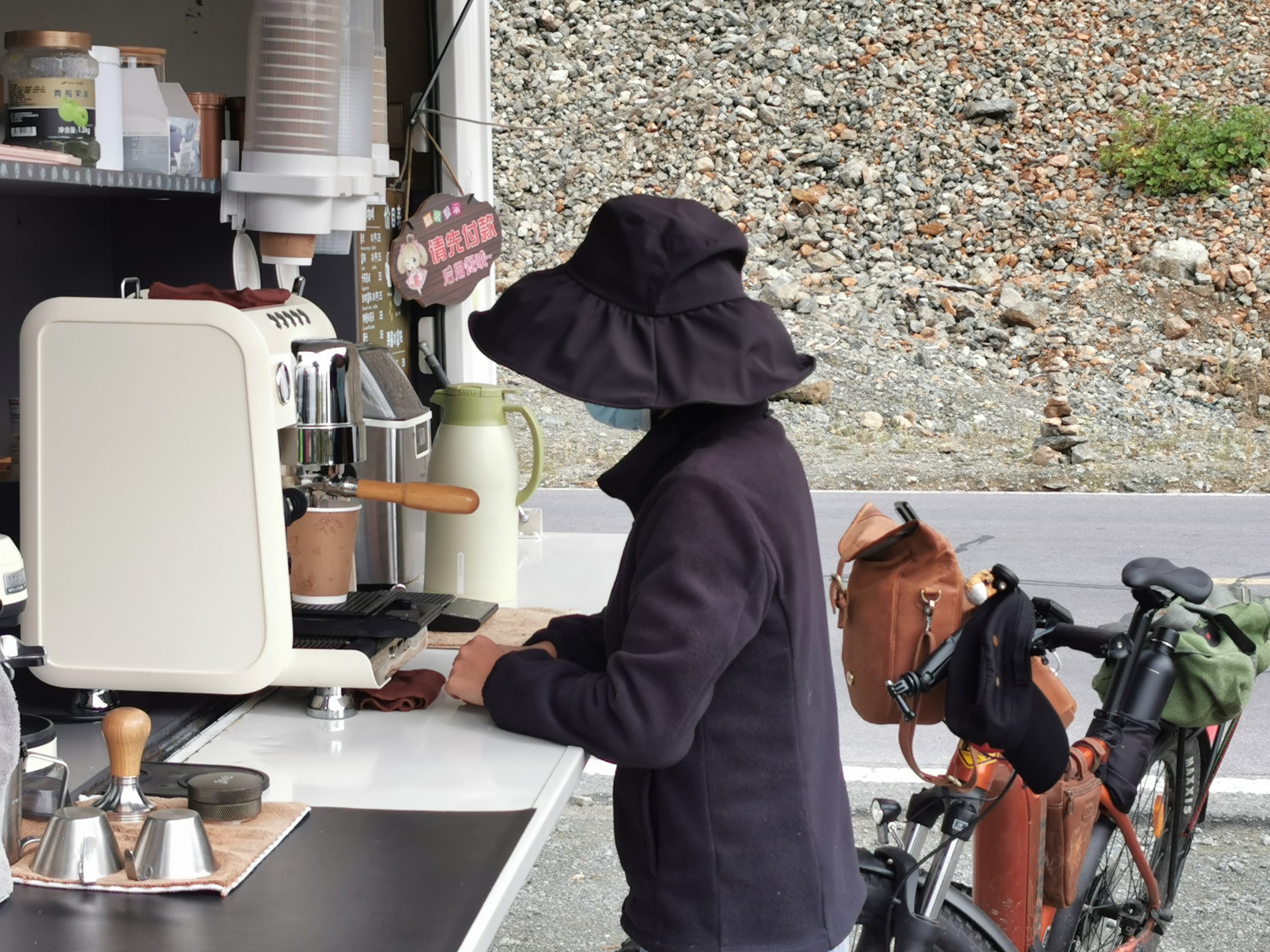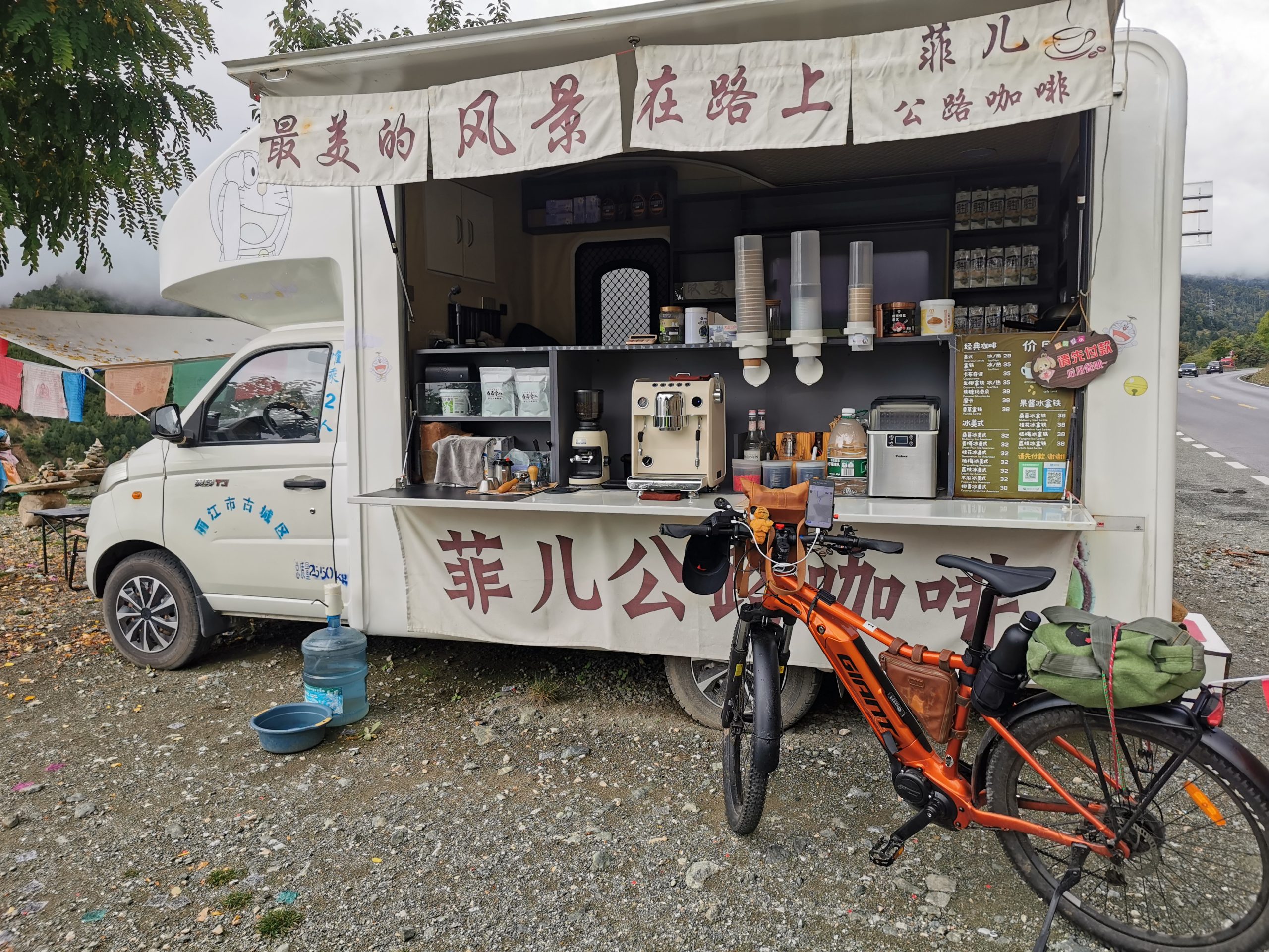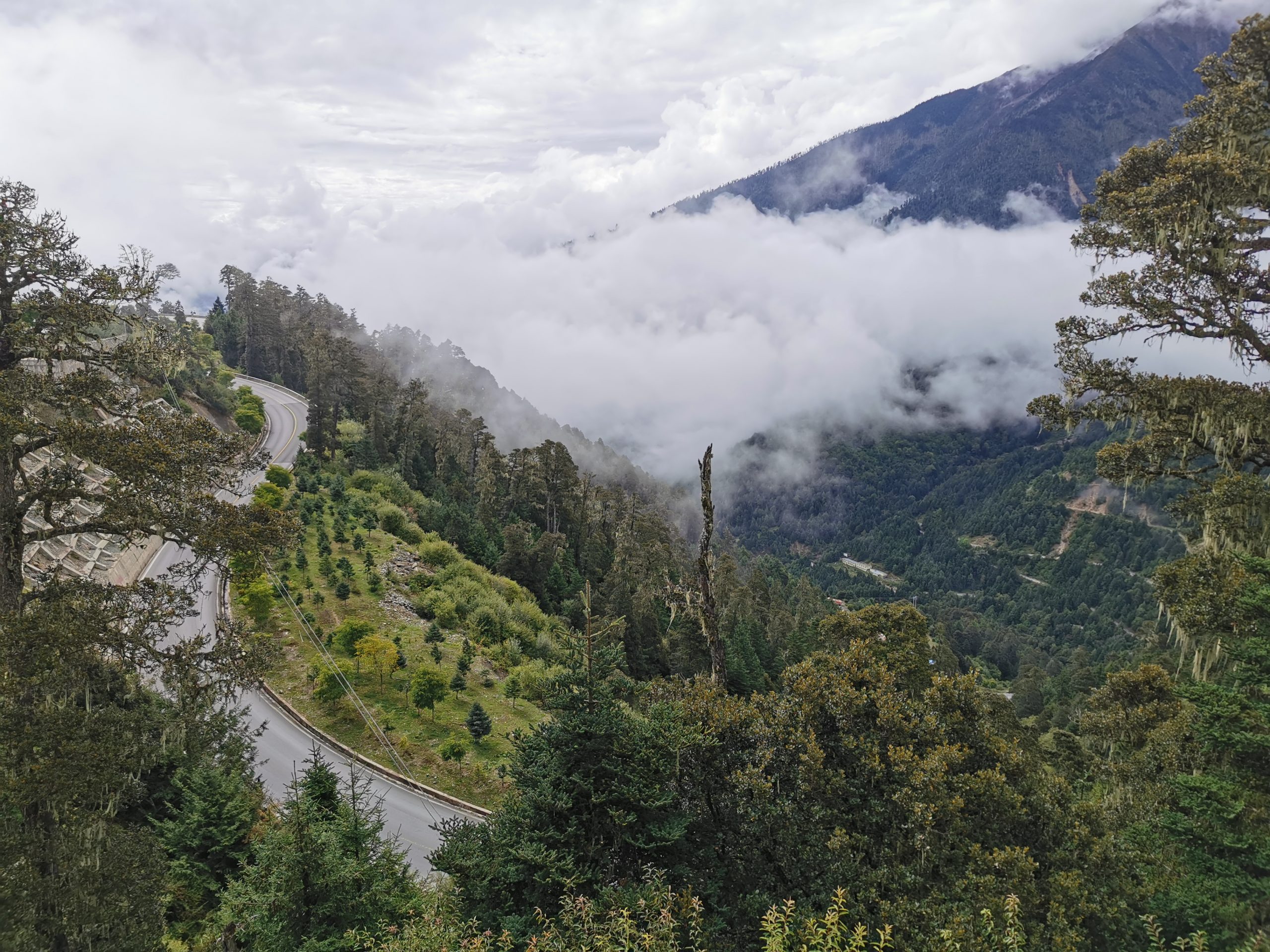 Der Morgennebel zieht die steilen Hänge hoch, mal ist der Blick ins Tal frei, mal zeigen sich die Berge. Andächtig radeln wir langsam die Serpentinen hoch, bis uns ein mobiler Kaffeestand zu einer Pause zwingt. Exzellenter Espresso Macchiato auf 3.500 Metern Höhe mit Blick ins Tal, wo hat man das schon! (Und wenn ja, sitzt man da kurzärmlich und -hosig ohne zu frieren?)