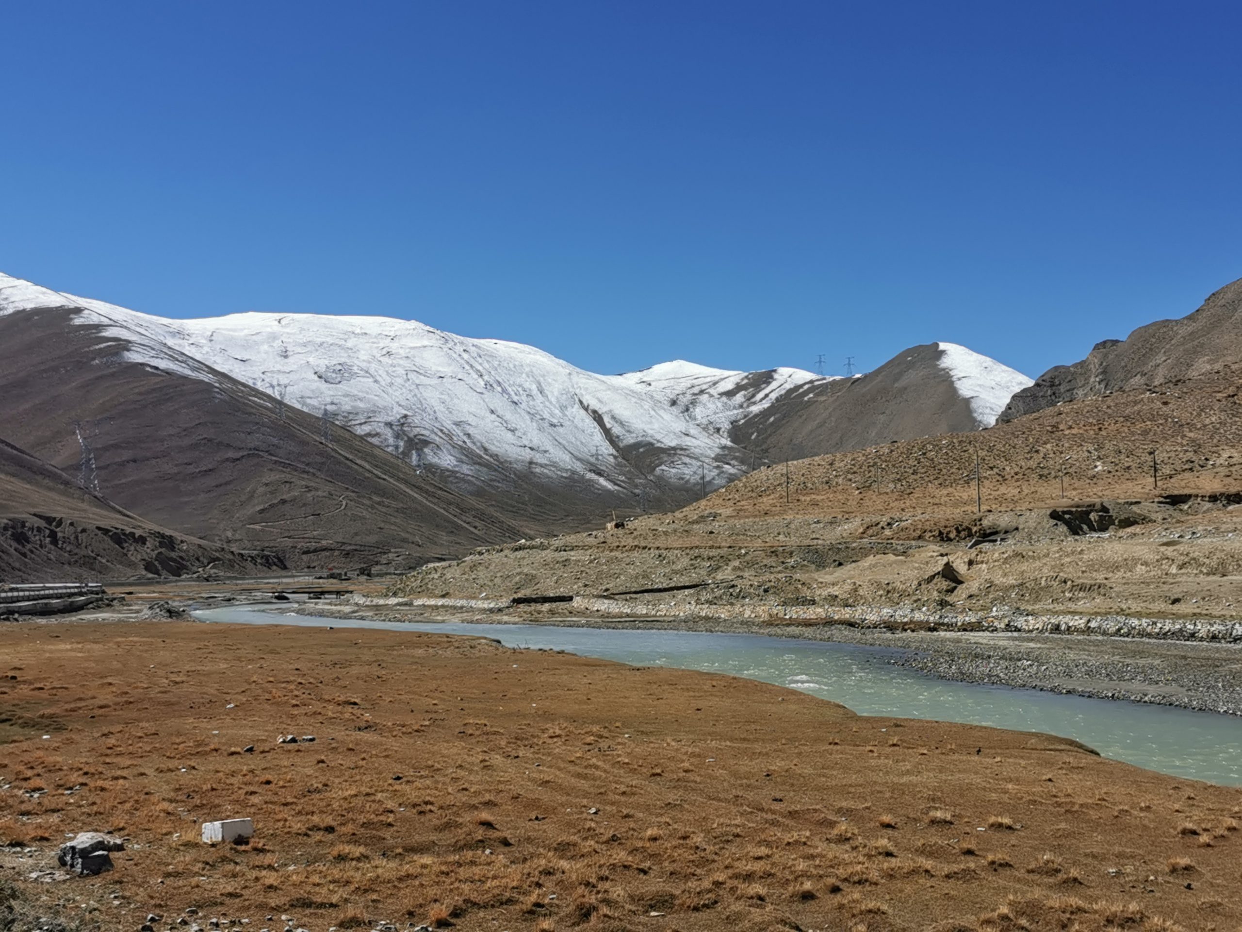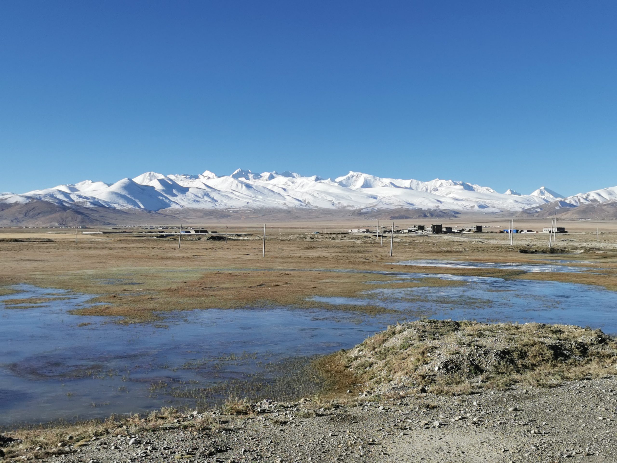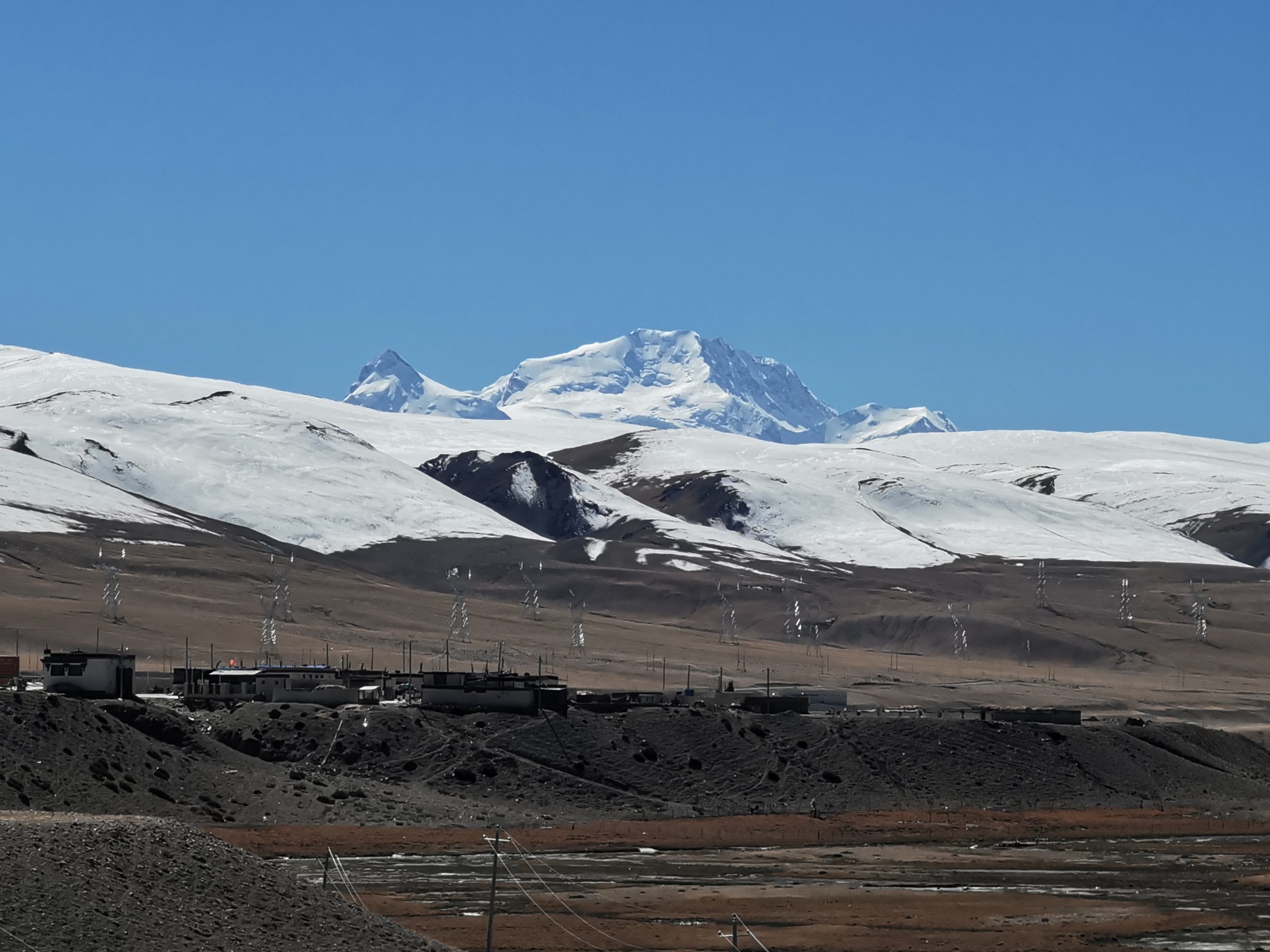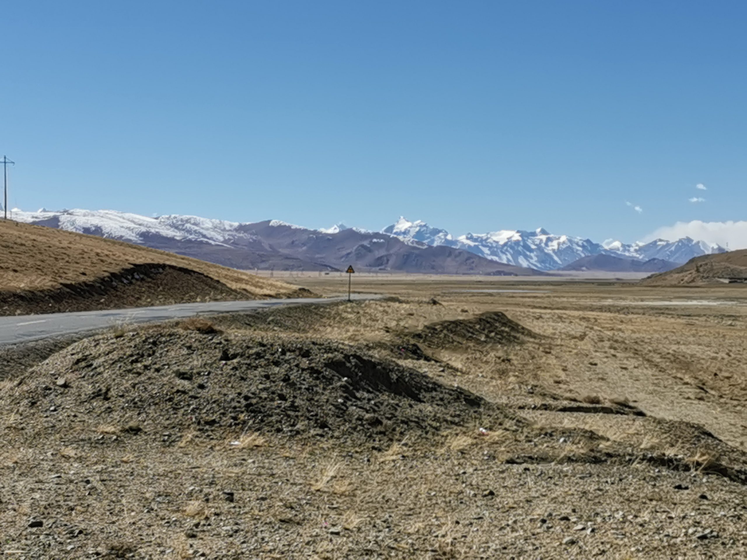 Den ganzen Tag lang begleiten uns noch Mt. Everest und Chu Oyo, werden hinter uns immer kleiner, bis sie schließlich nur noch ein Punkt hinter der Hochebene sind. Pünktlich übernimmt der Shishipangma, der Eben-mal-so-Achttausender und baut sich schneeweiß vor uns auf. Wir biegen in Richtung Silong ab und vor uns steht ein eindrucksvolles schneebedecktes Bergmassiv, eine Phalanx der Gerade-mal-nicht-Achttausender.