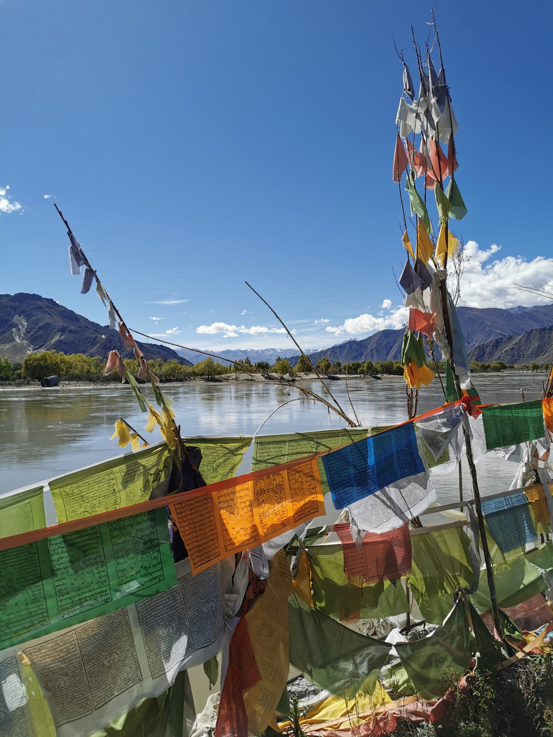 Im Laufe des Tages fallen die Hüllen, es fühlt sich in der Höhensonne sommerlich warm an, obwohl es noch nicht einmal 20 Grad hat. Gegen Mittag radeln wir dann kurzärmlich durch das wunderschöne Tal, der Lhasa-Fluss glänzt blau-grün in der Sonne.