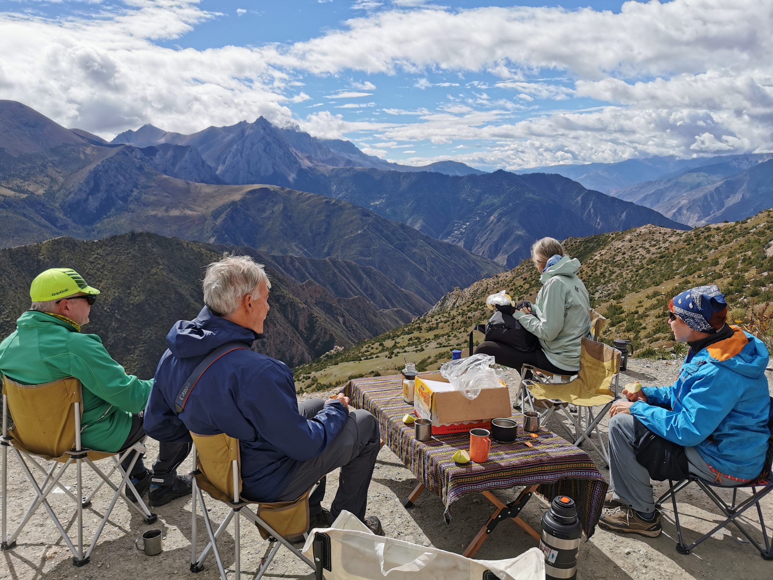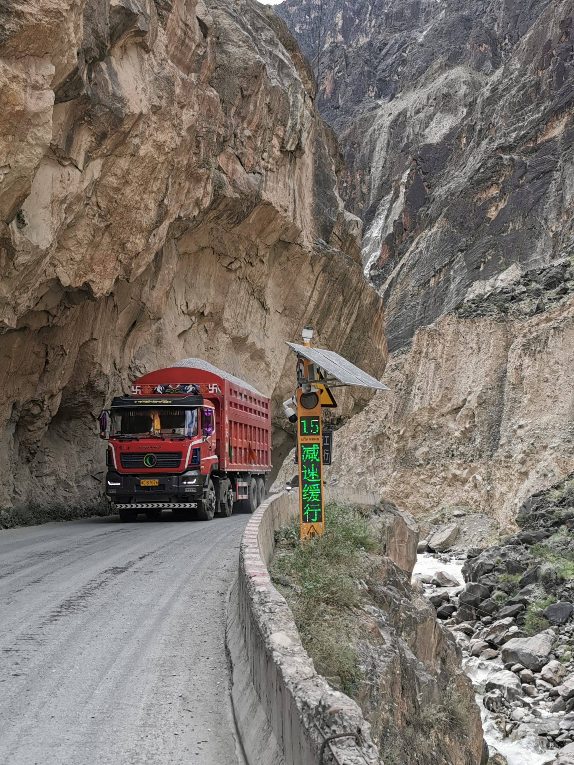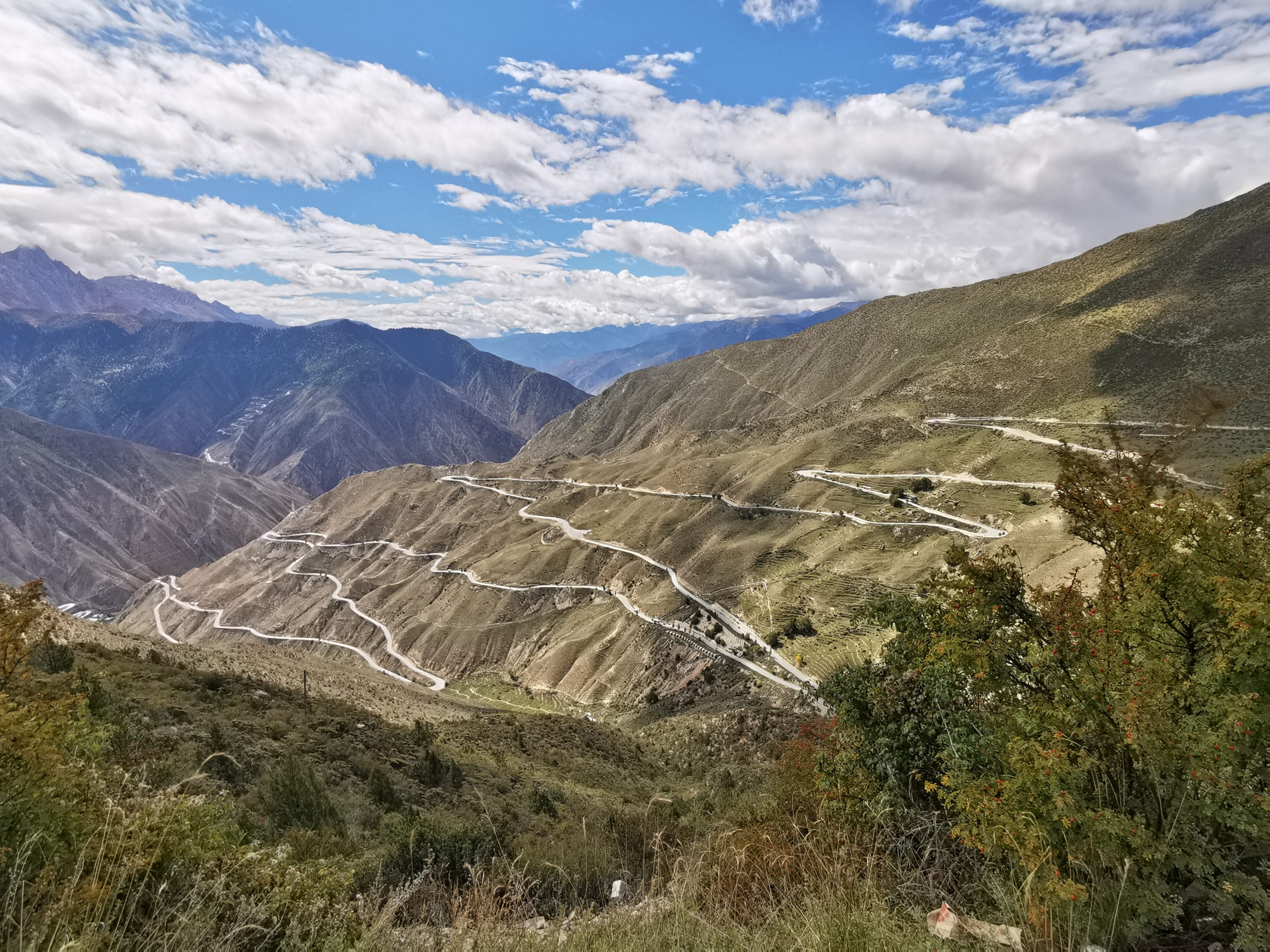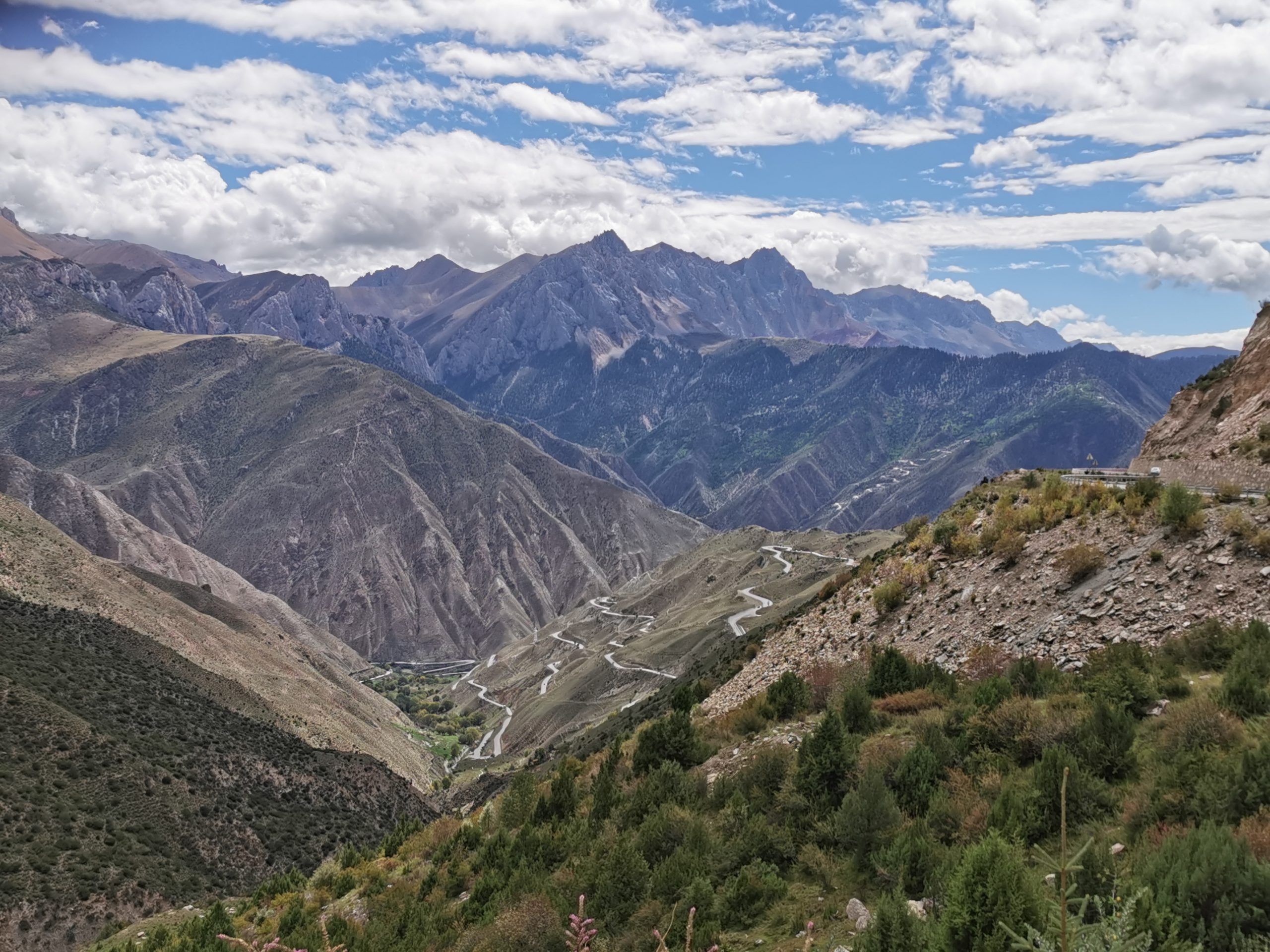 Und dann kommt eine Tour wie die heutige, die alles mitbringt, was eine legendäre Tagesetappe ausmacht: Landschaft, nein: Landschaften zum Niederknien. Zuerst der sanfte Pass hinaus aus dem Bangda-Grassland, auf dem hunderte Yaks grasen. Weit geschnittene Serpentinen, Morgenluft, es rollt angenehm meditativ den Berg hoch. Von der Passhöhe auf 4.610 Metern Höhe der Blick auf schroffe 6.000er, die auch in den Dolomiten stehen könnten, nur dass sie doppelt so hoch sind. Von der Passhöhe die epische Abfahrt über die 72 Kehren des Salween, wir rollen und genießen und kommen trotzdem kaum voran, weil hinter jeder Kurve ein weiteres spektakuläres Foto lauert. Auf den letzten 10 Kilometern Abfahrt dann Kontrastprogramm: Stau!