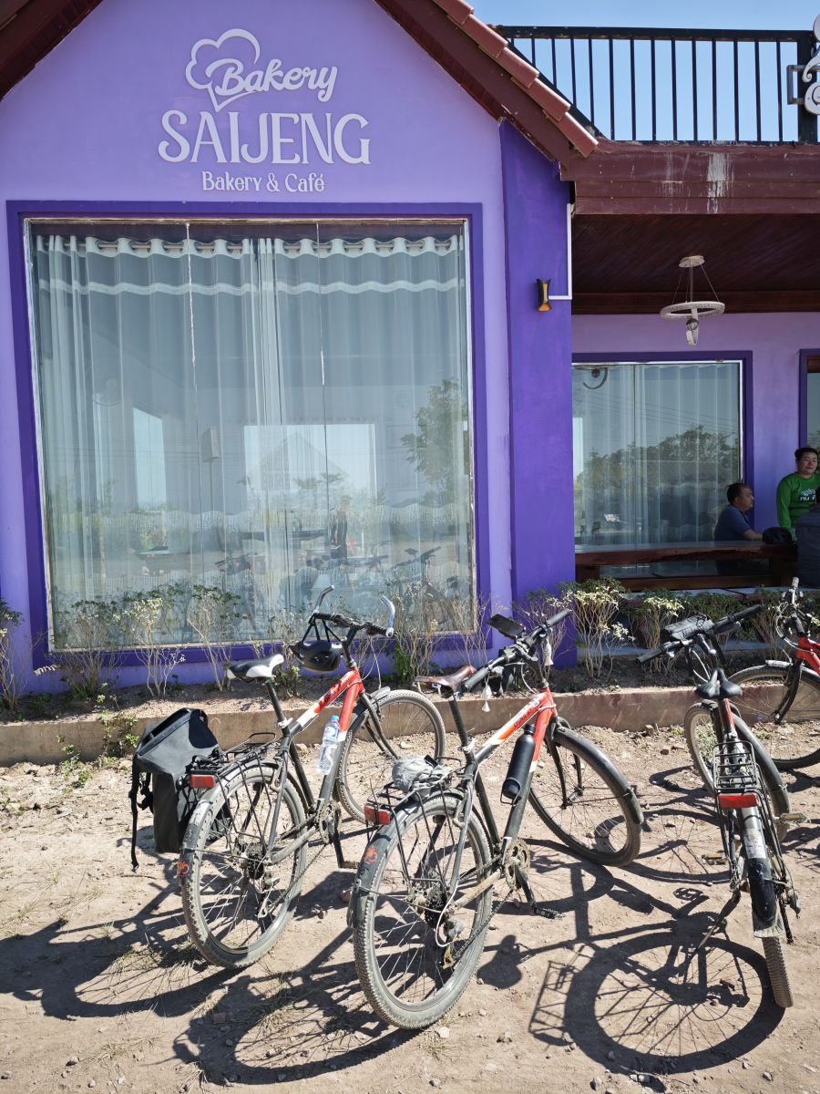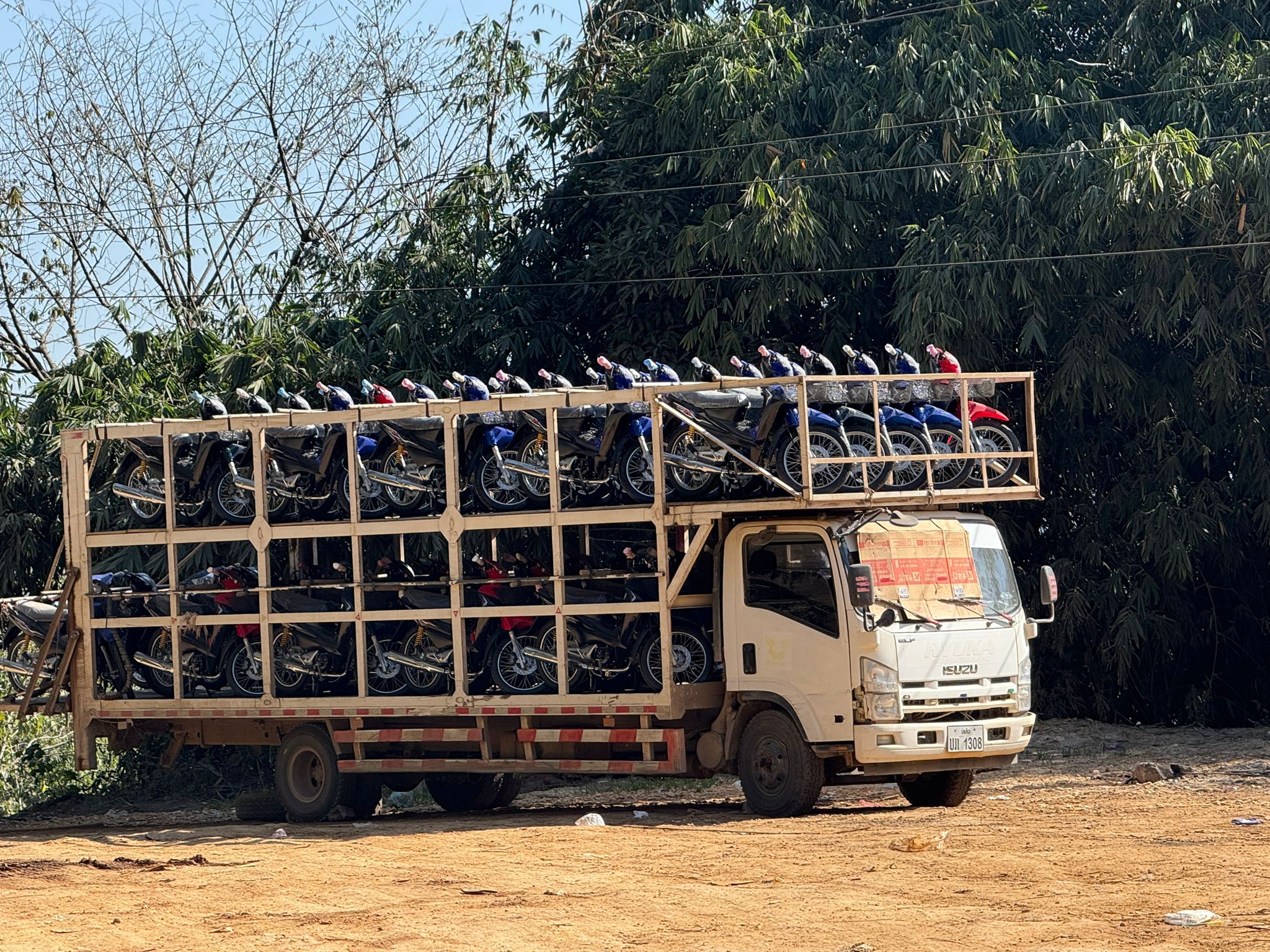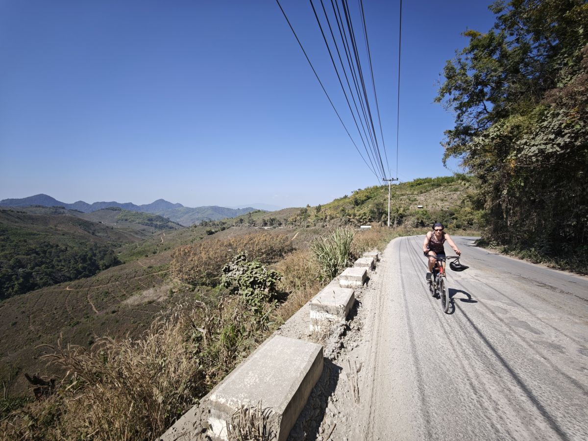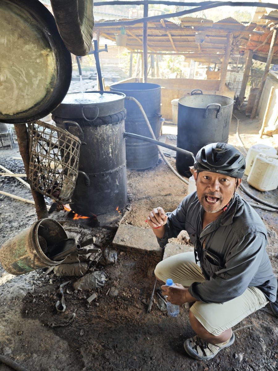 Der folgende Tag bringt dann deutlich bessere Straßenverhältnisse, auch wenn die Asphaltdecke immer wieder auf kurzen Abschnitten durch Rumpelstücke mit Sand und Stein unterbrochen wird. Dafür gibt es Traumblicke auf das Nordlaotische Mittelgebirge und die Berge, die Laos – etwas hundert Kilometer Luftlinie entfernt – von Vietnam trennen. Auf der Passhöhe, die letzte auf unserer Tour, gibt es sogar eine Bäckerei mit Nobelbaristamaschine und Kaffeetraumkarte. Leider gibt es keinen Barista und auch der Bäcker ist noch nicht gefunden. Also schnacken wir mit Bananen, Drachefrucht, Mandarinen und Keksen und lassen dann nach Udomxai rollen. Nun ja, fast, den kurzen aber steilen Anstieg kurz vor der Stadt hätte es nicht gebraucht. Eine Schnapsbrennerei haben wir auch noch besucht und ganz vorsichtig genippt. Vor dreißig Jahren schrieb der Lonely Planet über Udomxai: „Jetzt abends auch mit Beleuchtung“. Heute ist Udomxai ein wichtiger Verkehrs- und Handelsknotenpunkt, der chinesische Einfluss ist nicht zu übersehen, wir übernachten in dem gleichen Gebäude, in dem ich 2023 bei der Erkundung schon geschlafen habe, jetzt kein zweckmäßiger Betonbau mehr, sondern ein schickes Boutiquehotel im laotischen Stil mit Holzfußboden und mächtig Platz, das Gepäck im Zimmer zu verstreuen. Im Erdgeschoß gibt es sogar eine Nobelbaristamaschine und Kaffeetraumkarte.