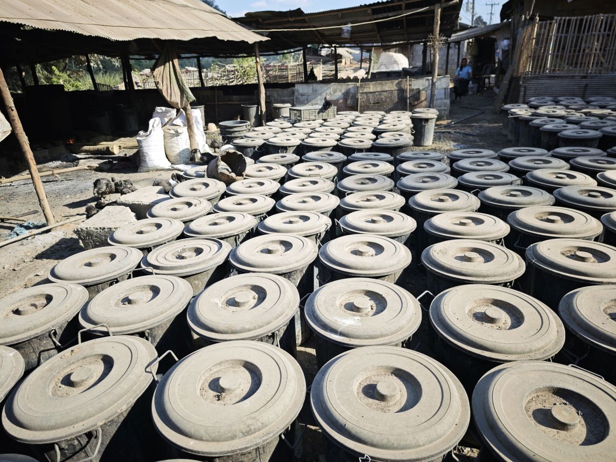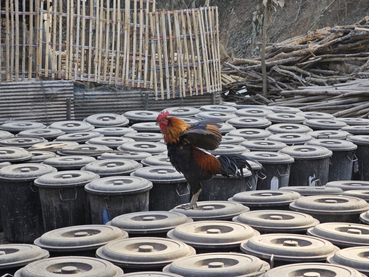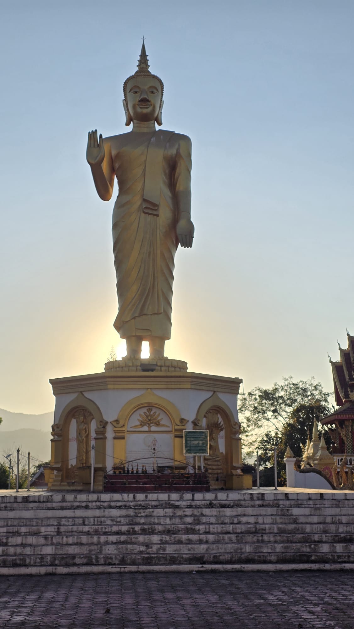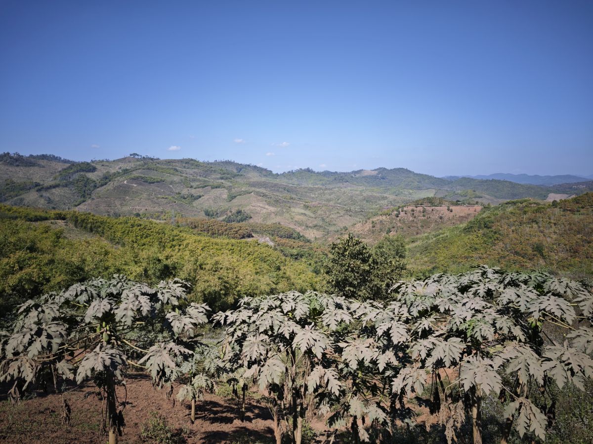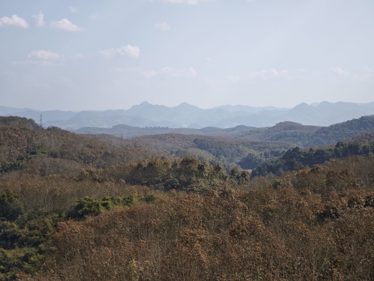 Der folgende Tag bringt dann deutlich bessere Straßenverhältnisse, auch wenn die Asphaltdecke immer wieder auf kurzen Abschnitten durch Rumpelstücke mit Sand und Stein unterbrochen wird. Dafür gibt es Traumblicke auf das Nordlaotische Mittelgebirge und die Berge, die Laos – etwas hundert Kilometer Luftlinie entfernt – von Vietnam trennen. Auf der Passhöhe, die letzte auf unserer Tour, gibt es sogar eine Bäckerei mit Nobelbaristamaschine und Kaffeetraumkarte. Leider gibt es keinen Barista und auch der Bäcker ist noch nicht gefunden. Also schnacken wir mit Bananen, Drachefrucht, Mandarinen und Keksen und lassen dann nach Udomxai rollen. Nun ja, fast, den kurzen aber steilen Anstieg kurz vor der Stadt hätte es nicht gebraucht. Eine Schnapsbrennerei haben wir auch noch besucht und ganz vorsichtig genippt. Vor dreißig Jahren schrieb der Lonely Planet über Udomxai: „Jetzt abends auch mit Beleuchtung“. Heute ist Udomxai ein wichtiger Verkehrs- und Handelsknotenpunkt, der chinesische Einfluss ist nicht zu übersehen, wir übernachten in dem gleichen Gebäude, in dem ich 2023 bei der Erkundung schon geschlafen habe, jetzt kein zweckmäßiger Betonbau mehr, sondern ein schickes Boutiquehotel im laotischen Stil mit Holzfußboden und mächtig Platz, das Gepäck im Zimmer zu verstreuen. Im Erdgeschoß gibt es sogar eine Nobelbaristamaschine und Kaffeetraumkarte.