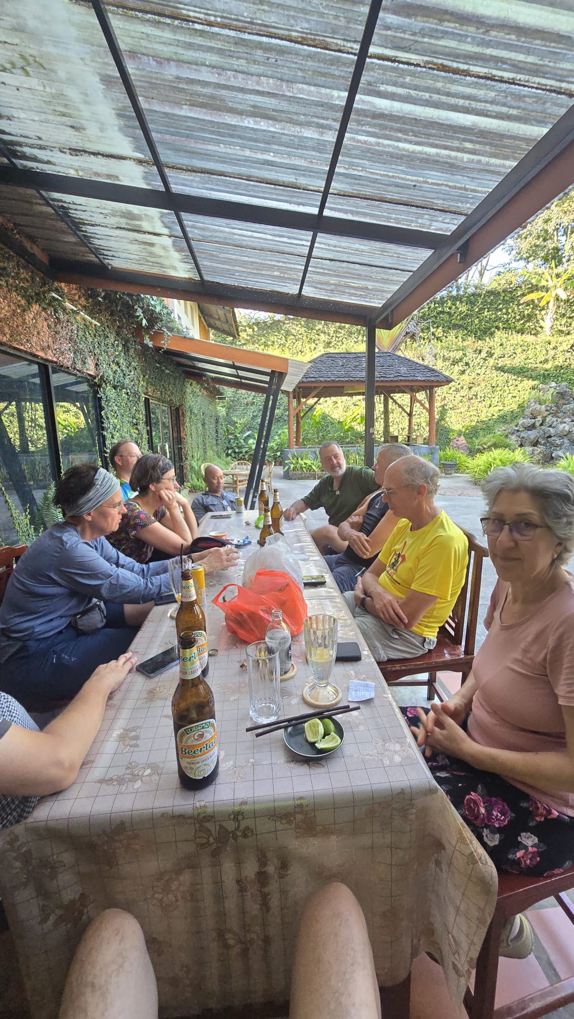 Die Staubstrecke von vorgestern überbrücken wir mit dem Begleitfahrzeug. In Nateuil essen wir in der selben Nudelbude wie auf dem Hinweg, was den etwa vierjährigen Sohn der Familie sehr freut, er schießt nun nicht mehr mit dem Spielzeuggewehr auf uns, sondern bietet uns Süßigkeiten an. Es gibt wieder Pho, danach steigen wir entspannt auf die Räder, heute sind nur 27 Kilometer und kaum Höhenmeter angesagt. Entsprechend früh sind wir im Guesthouse, über das auf jeden Fall gesagt werden kann, dass es deutlich besser ist als das, in dem wir auf früheren Touren übernachtet haben. Was nicht viel heißt, aber es ist sauber und alle bis auf Ulrich kommen in den Genuß einer warmen Dusche. Bei Ulrich fehlen leider Schlauch und Duschkopf, ein bisschen Schwund ist immer! Abendessen gibt es einfach, aber lecker auf dem lokalen Markt.
