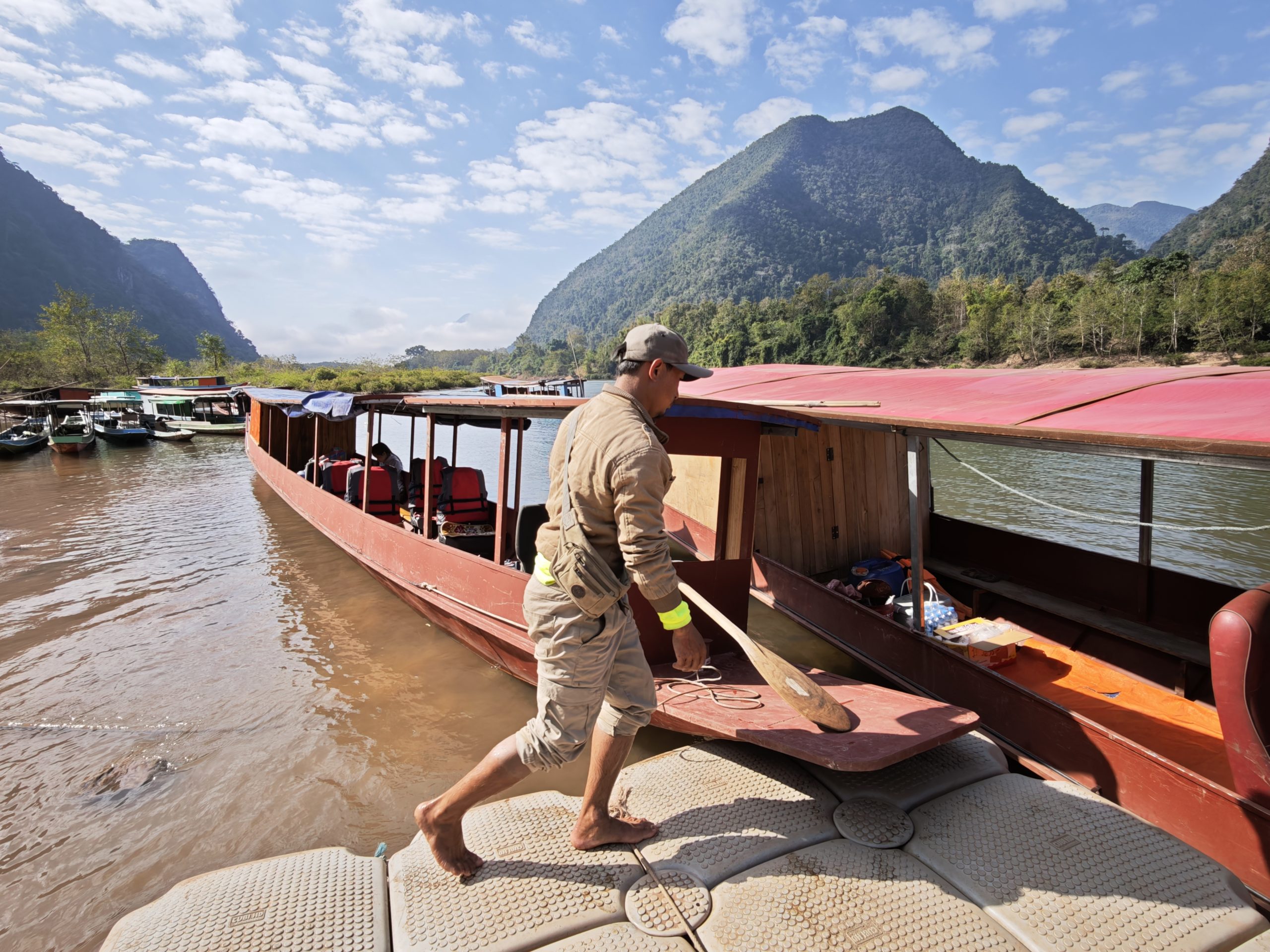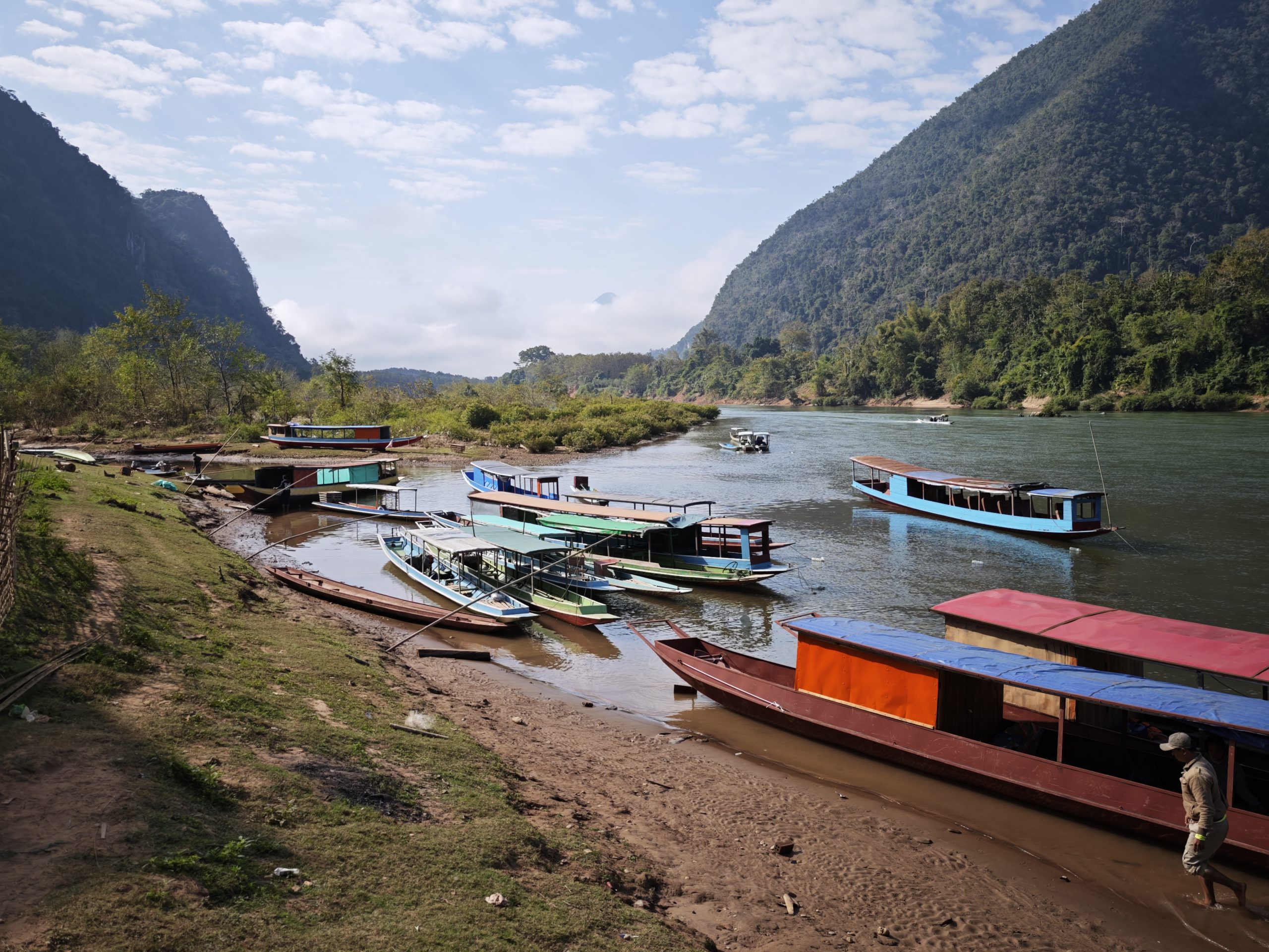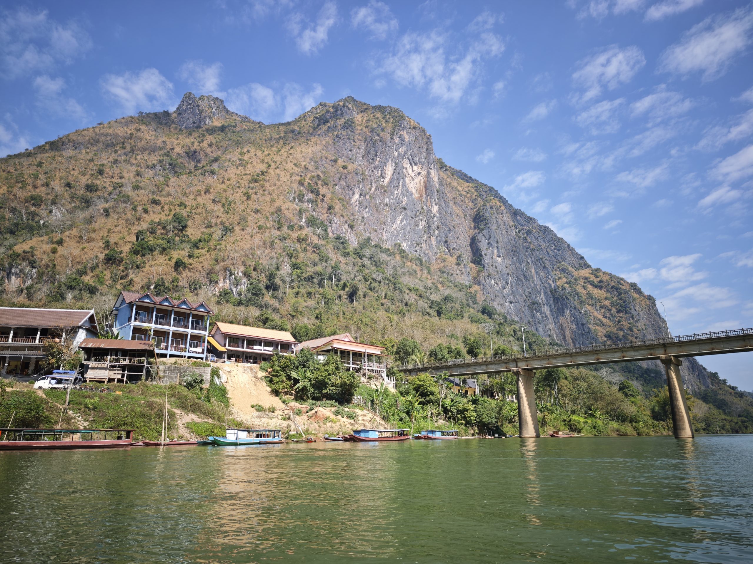 Wir lassen es heute gemächlich angehen, entspanntes Frühstück mit Blick auf den Nam Ou, gut eine Stunde Flussfahrt und dann – nein, nicht direkt auf die Räder, weil mein Hinterrad platt ist. Hat der Busfahrer, der leider eine unrühmliche Ausnahme der ansonsten exzellenten Busfahrer auf unseren Touren ist, hat das schon gestern gemerkt, aber keine Veranlassung gesehen, es Toh oder mir mitzuteilen. Hat das Rad dann einfach zu den anderen gestellt, vielleicht merkt es ja keiner…