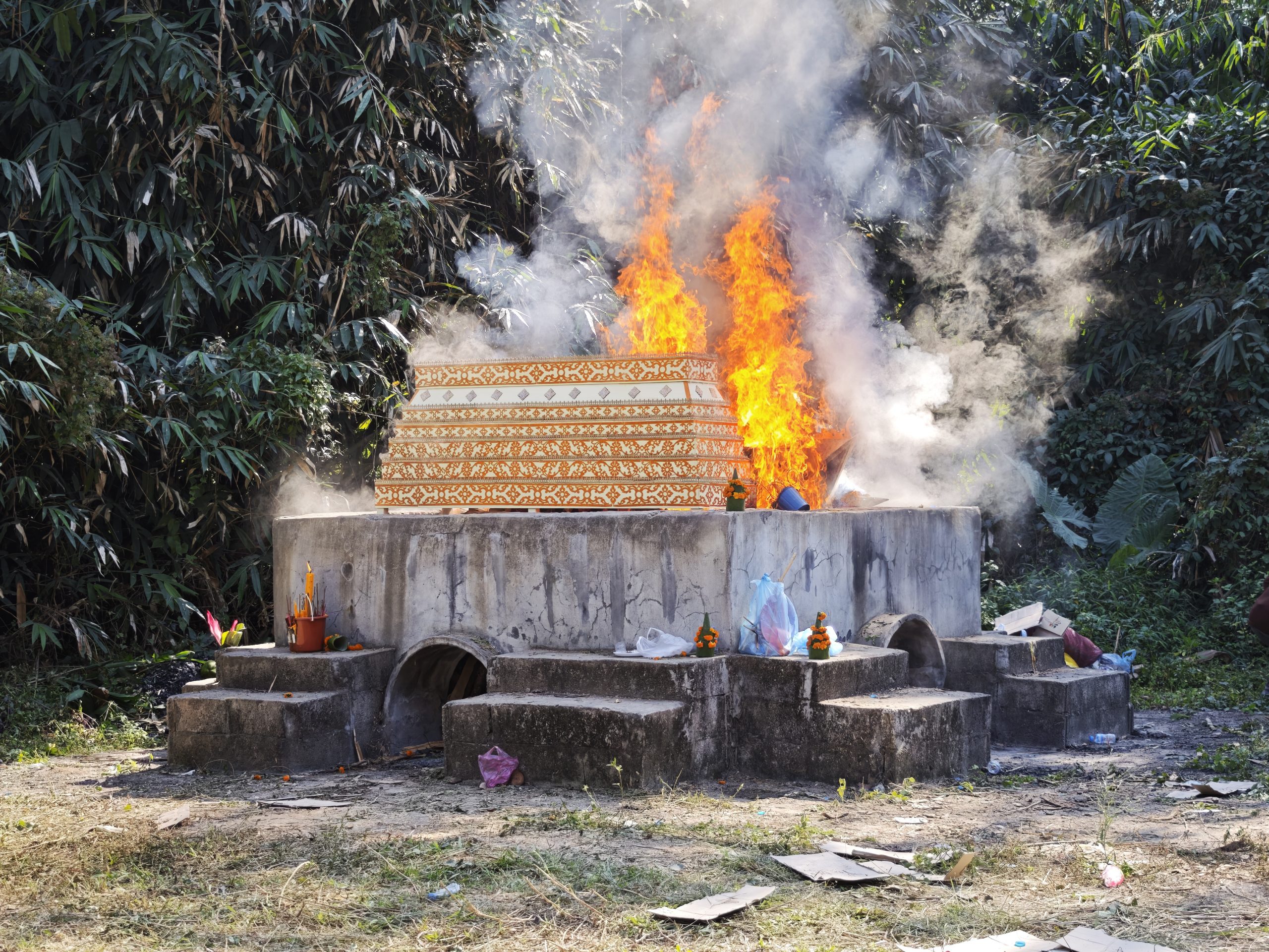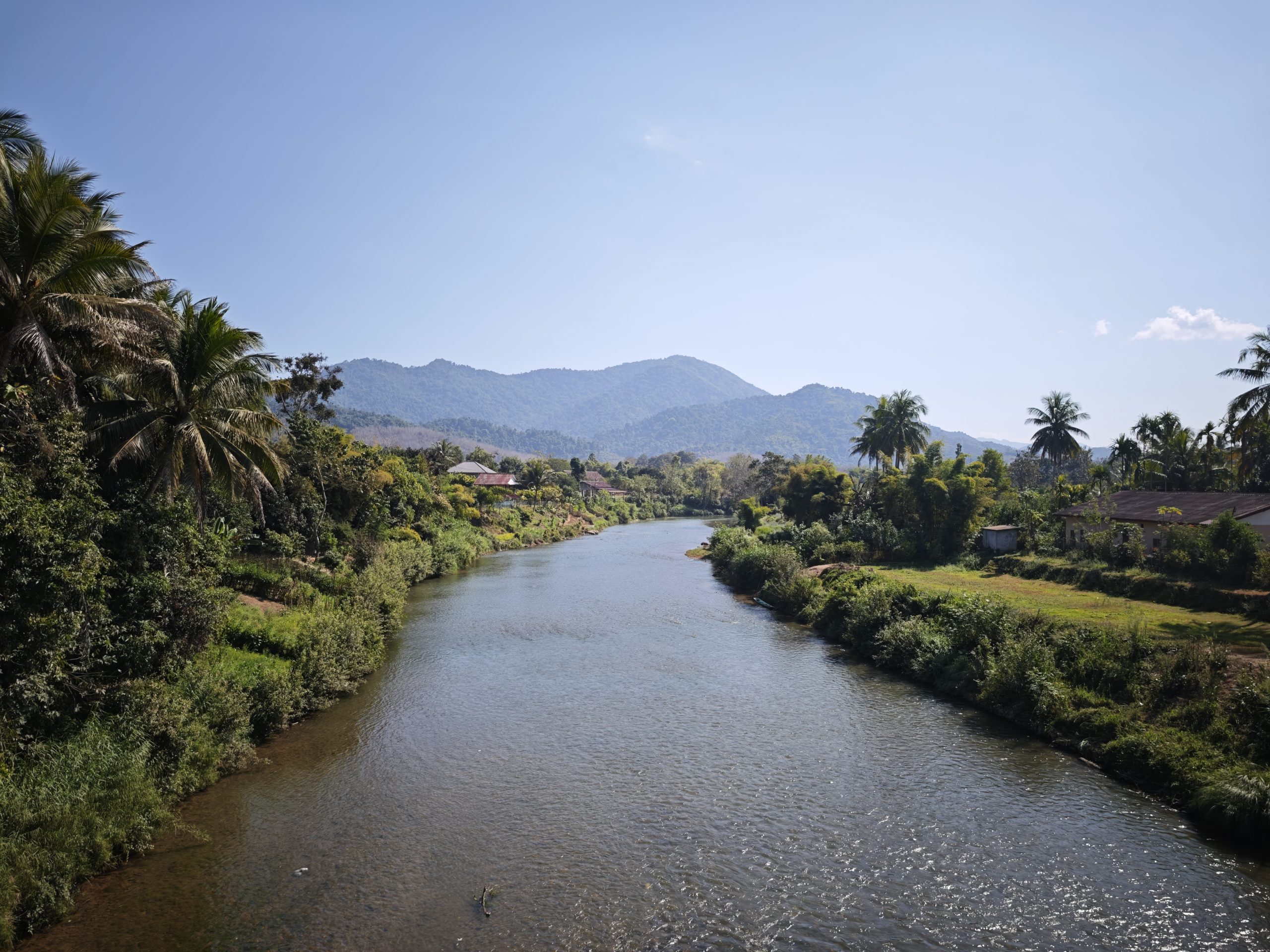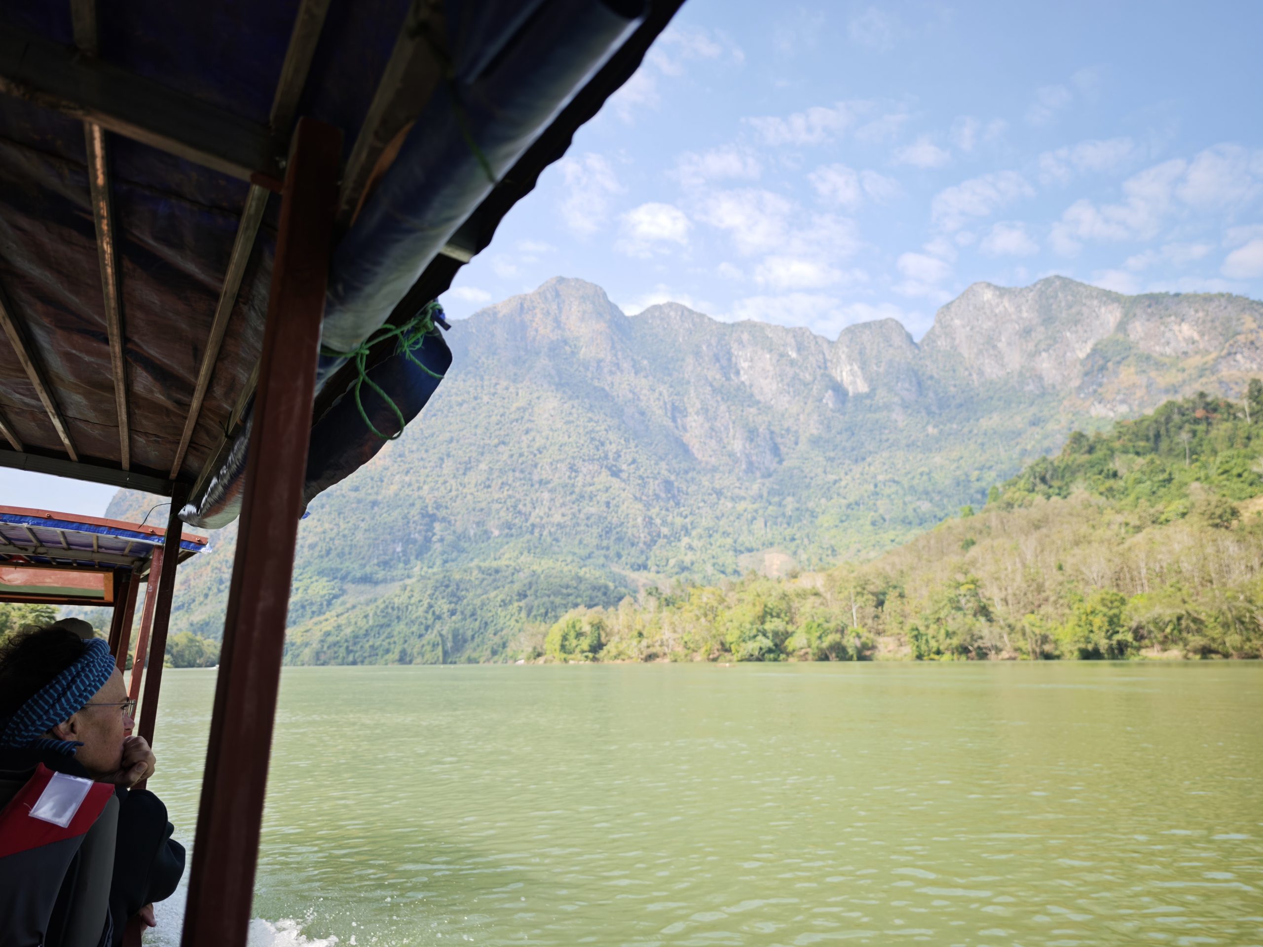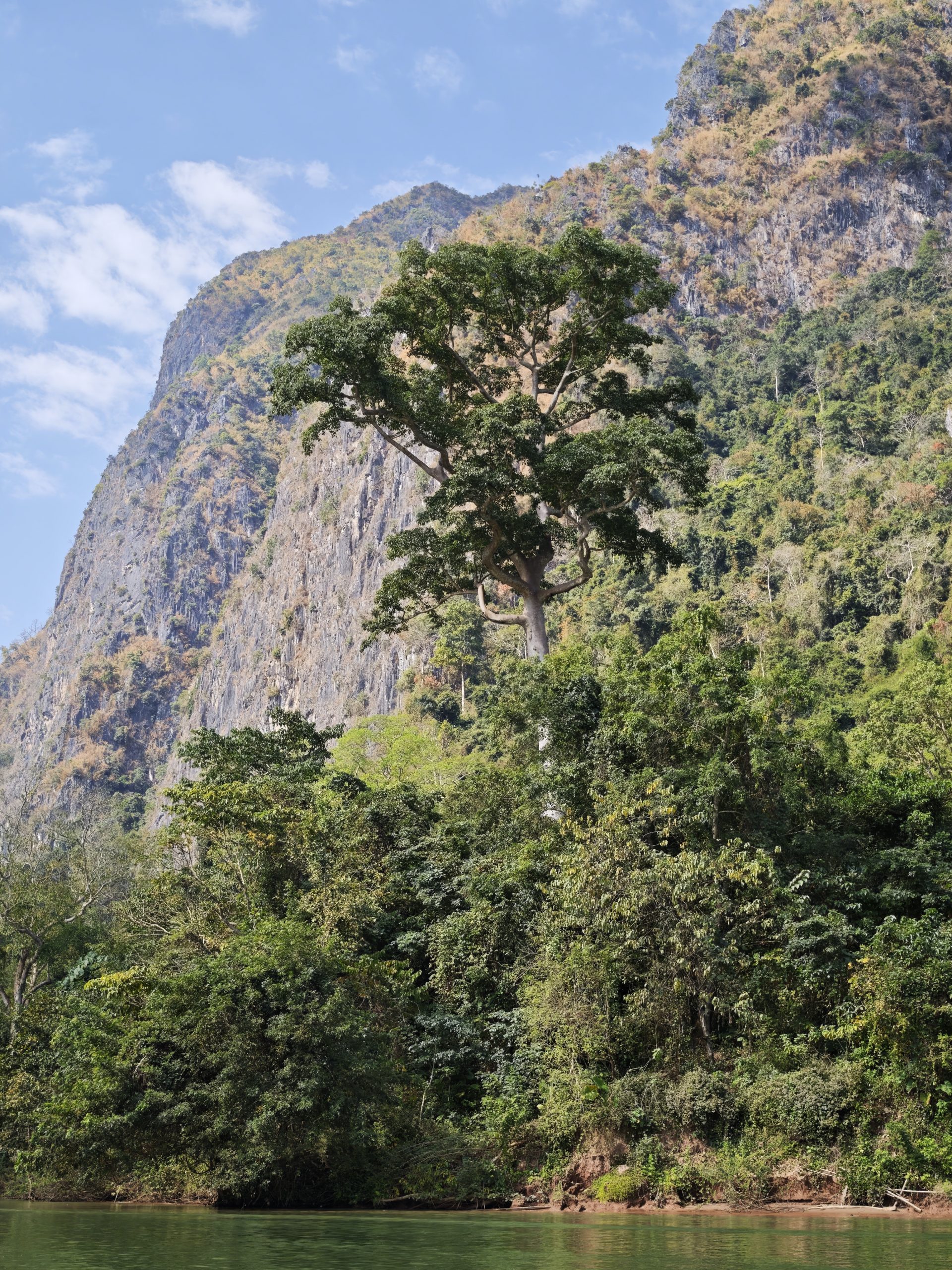 Wir lassen es heute gemächlich angehen, entspanntes Frühstück mit Blick auf den Nam Ou, gut eine Stunde Flussfahrt und dann – nein, nicht direkt auf die Räder, weil mein Hinterrad platt ist. Hat der Busfahrer, der leider eine unrühmliche Ausnahme der ansonsten exzellenten Busfahrer auf unseren Touren ist, hat das schon gestern gemerkt, aber keine Veranlassung gesehen, es Toh oder mir mitzuteilen. Hat das Rad dann einfach zu den anderen gestellt, vielleicht merkt es ja keiner…