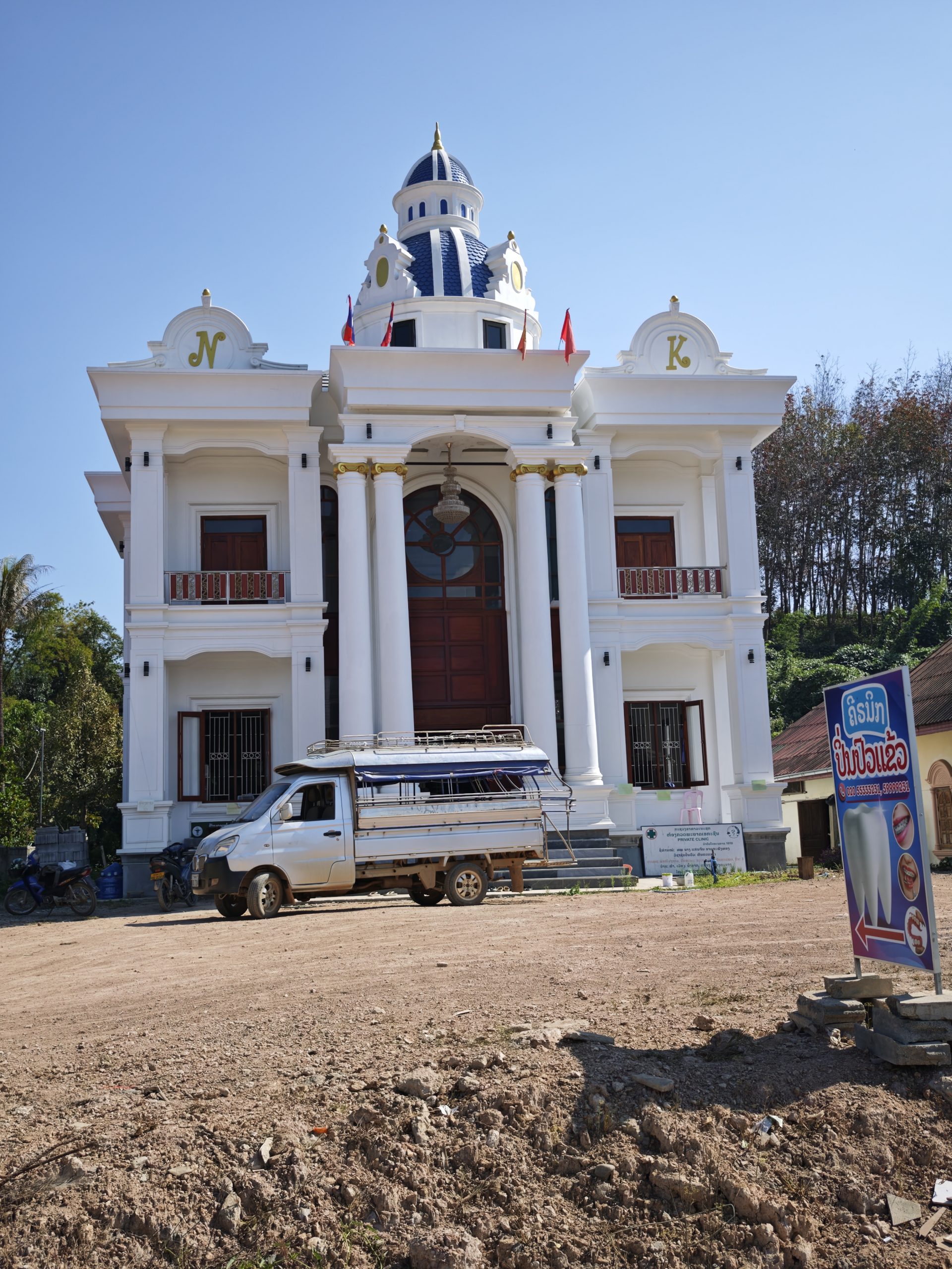 Nachdem ich wieder Luft im Reifen und zum Atmen habe, radeln wir meist entspannte 45 Radkilometer nach Nam Thouam, eins ein kleines Dorf, dankt chinesischer Inverstoren nun immerhin eine Kleinstadt mit mehr als 20 000 Einwohnern. Und einem chinesischen Restaurant, das wie eine Garage aussieht und in das, passend, auch nach zehn Minuten unserer Anwesenheit zwei Motorroller einknattern.