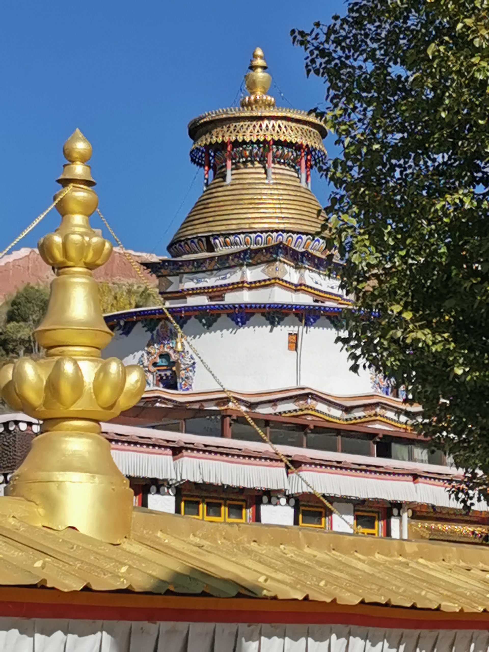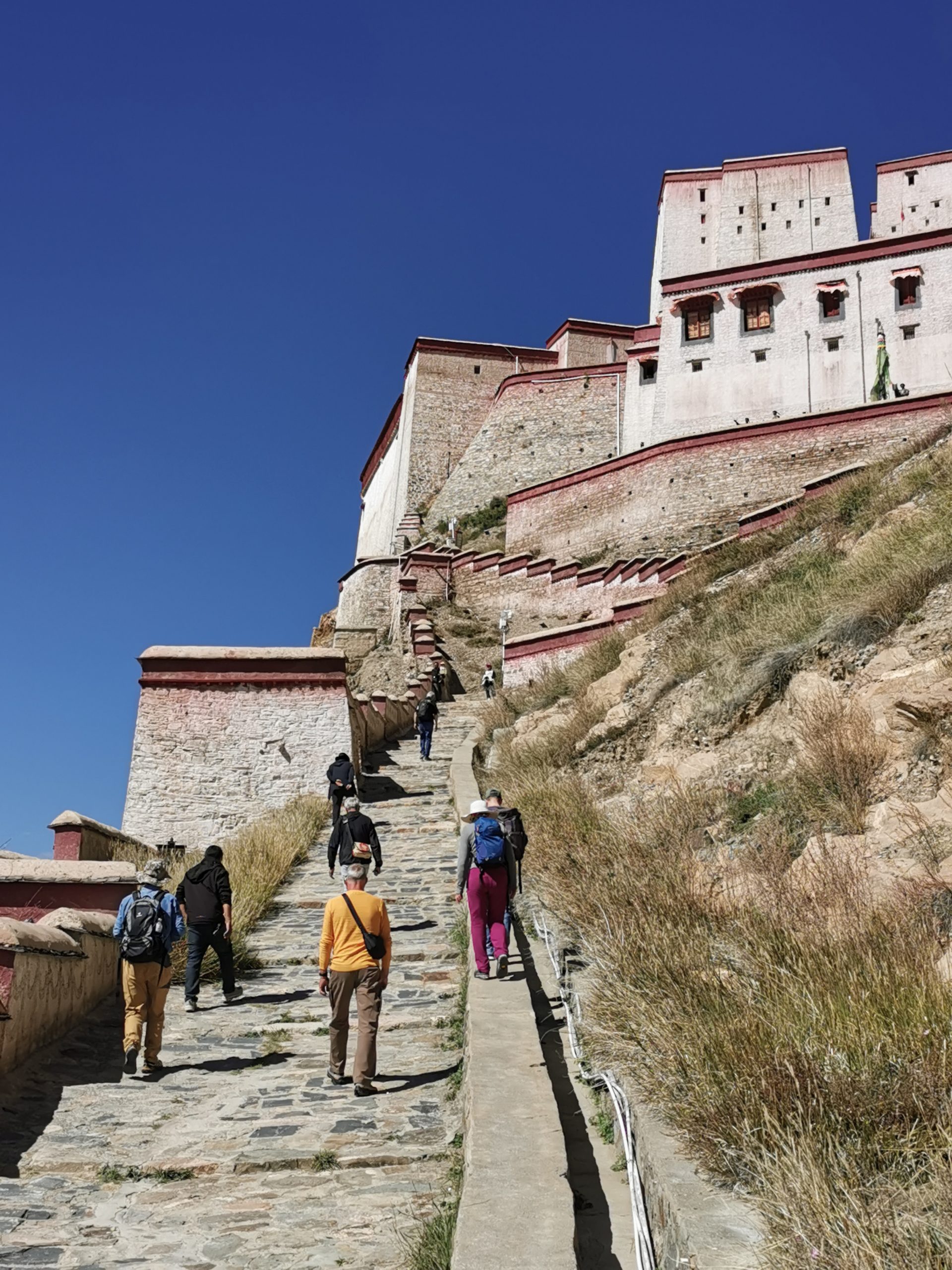 Ruhetag bedeutet, dass wir bis 15 Uhr Besichtigungsprogramm haben – aber höchst freiwillig, da das lokale Kloster, das Pelkor Chöde nicht nur eindrucksvoll bunt in der Sonne glänzt, sondern auch eines der schönsten und interessantesten der Region ist. Und der Blick vom Fort Gyantse entschädigt für den langen, steilen Weg auf die höchste Aussichtsplattform. Wir sind wieder einmal sprachlos – auch weil erst einmal eine Minute nach Luft gejapst wird. 100 Kilometer auf dieser Höhe – immer wieder gerne. 100 Höhenmeter treppauf – nur wenn oben Traumsicht lockt.