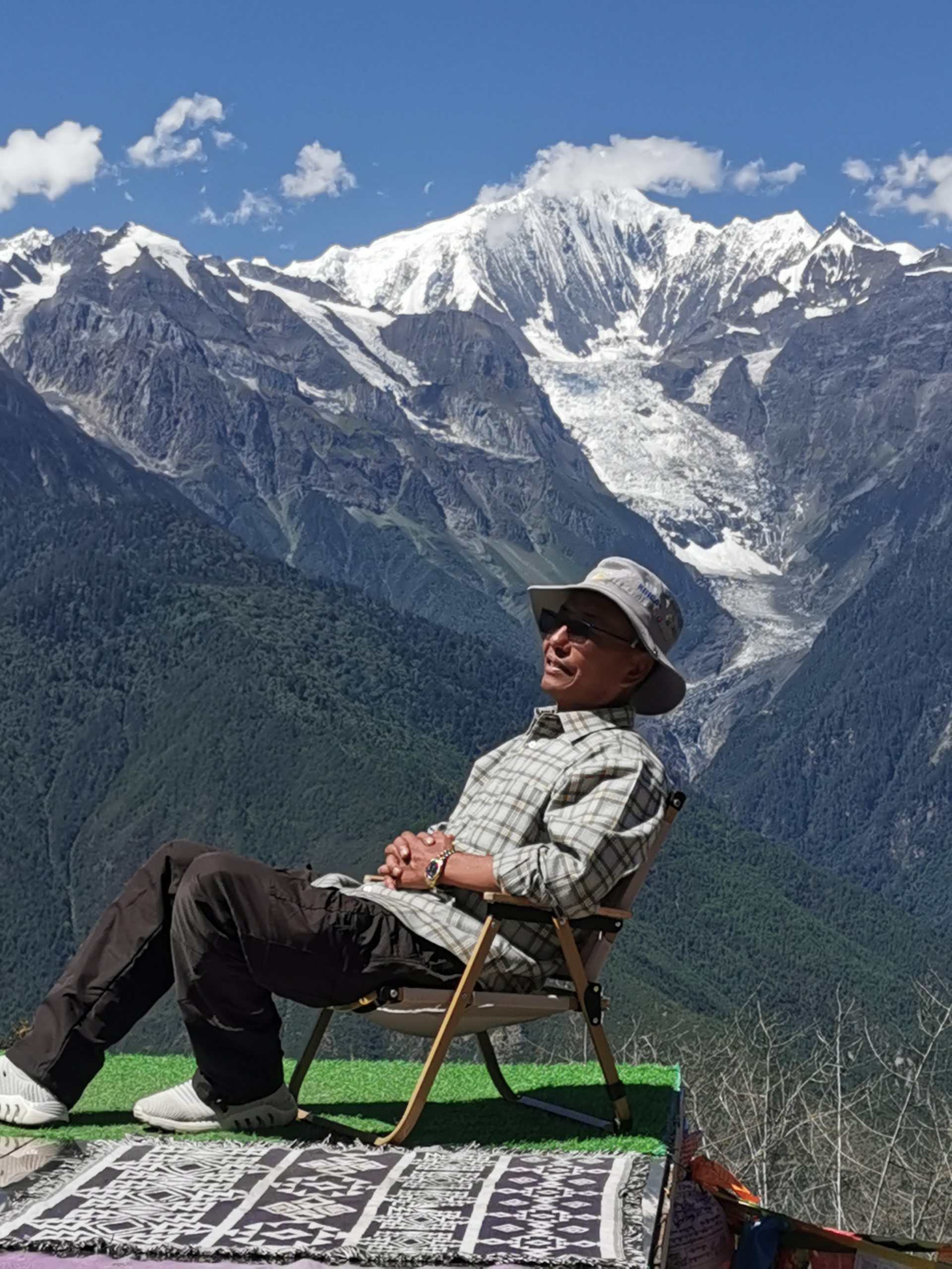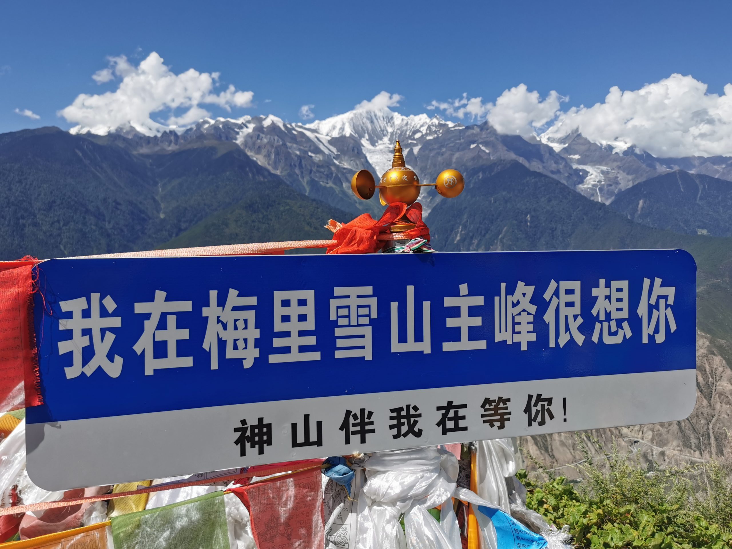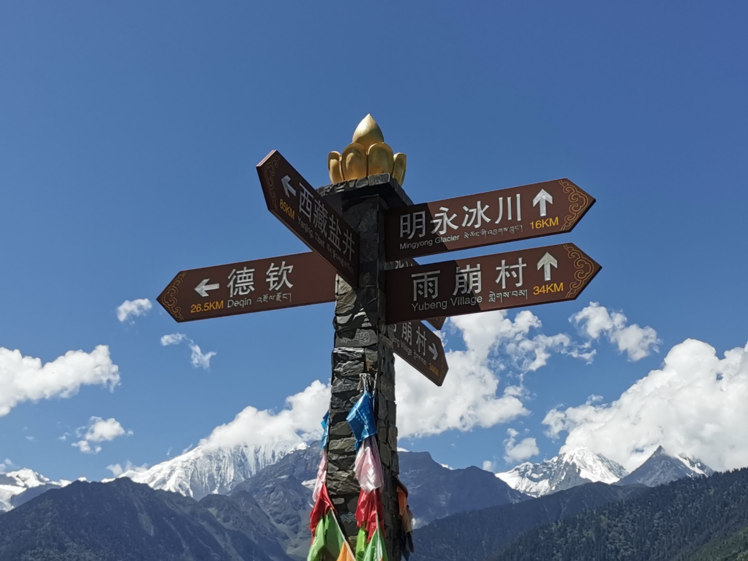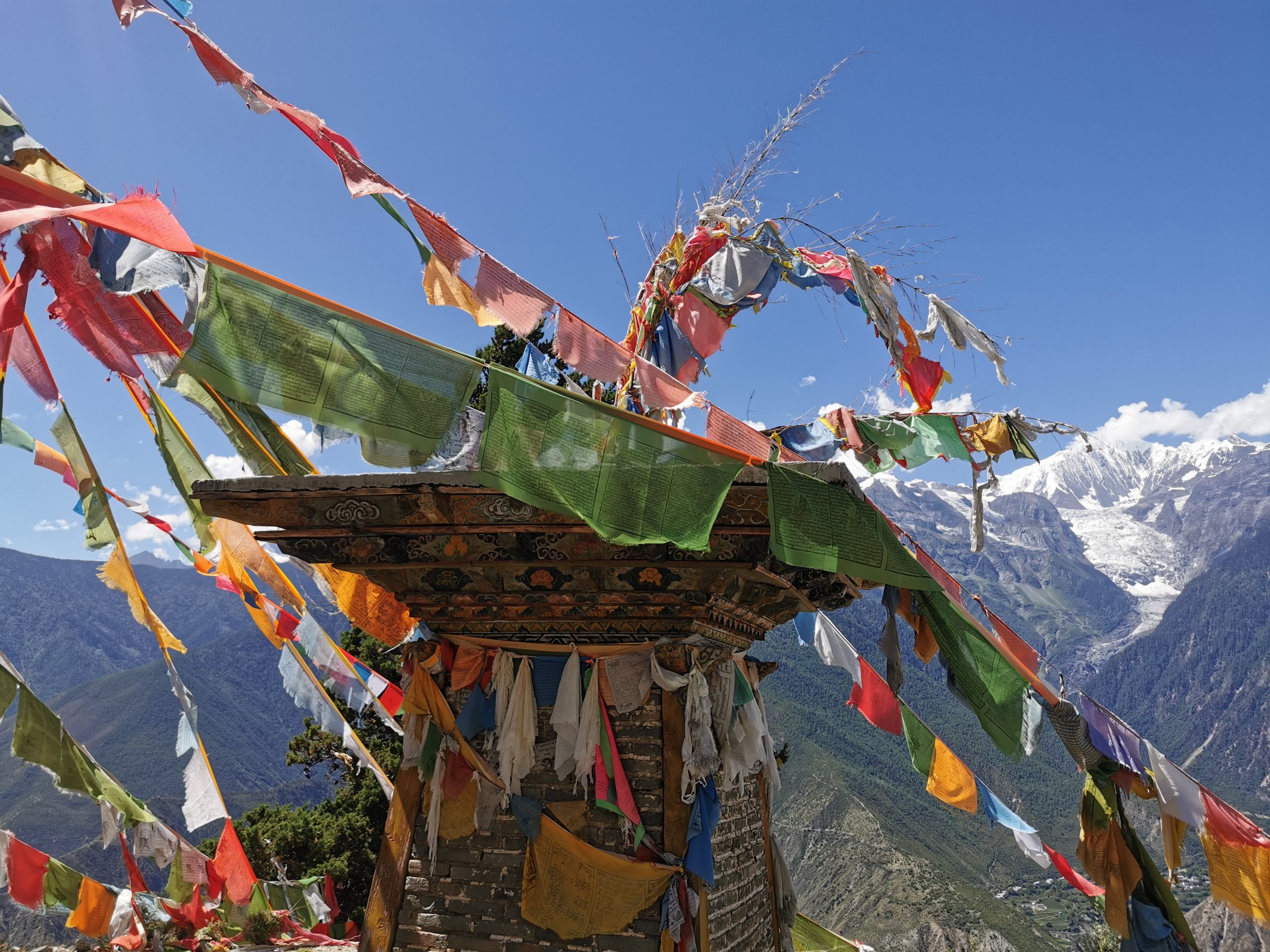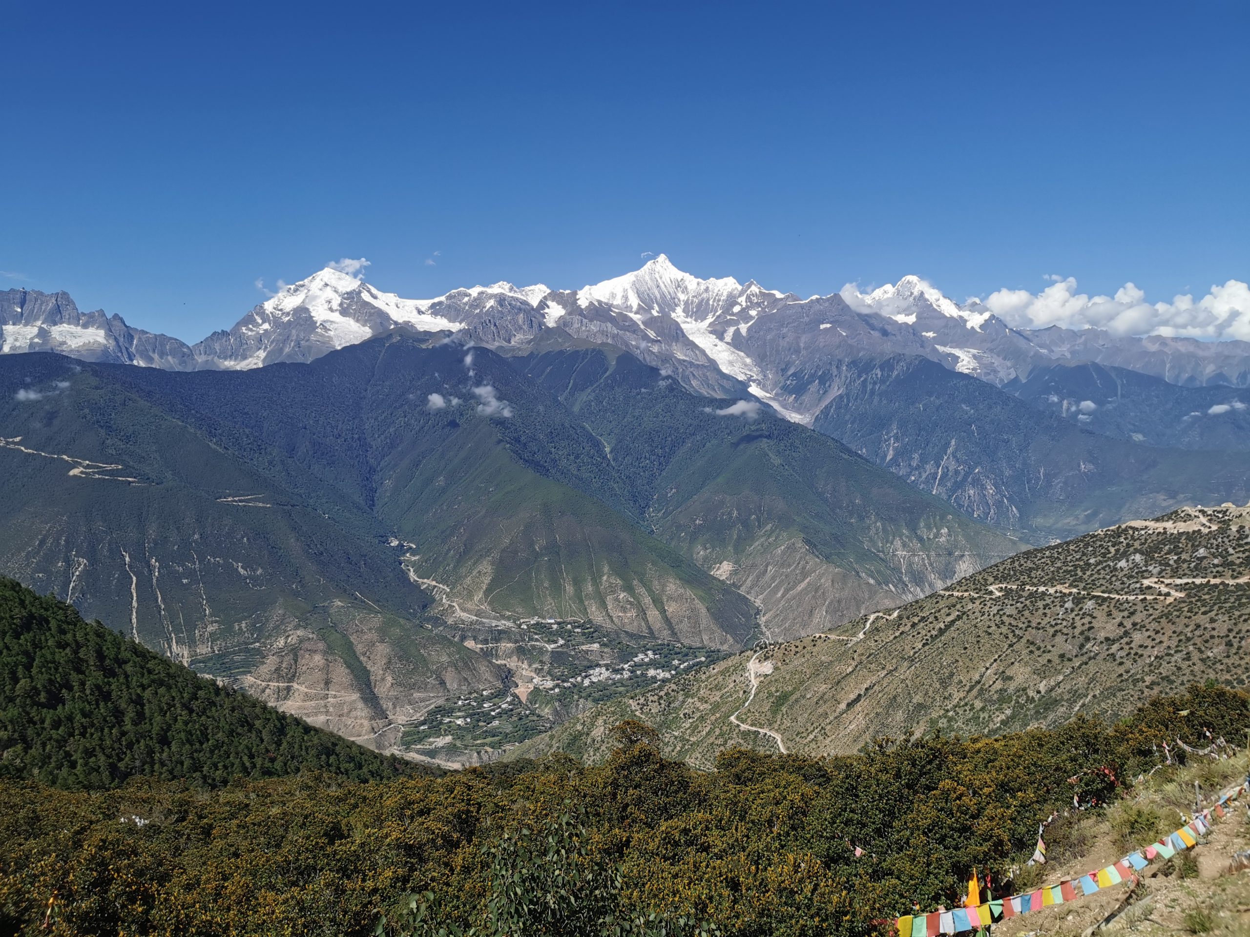 Und das bleibt auch so, den ganzen Tag lang. Wir können uns gar nicht sattsehen am Kawo-Karpa-Massiv, das fast 7.000 Meter über NN in die Höhe ragt und immerhin noch 5000 Meter über dem Mekong. Augenfutter für die nächsten zwei Stunden (Abfahrt). Unser tibetisches Begleitteam versorgt und mit Tee und Kaffee, Sonam, unser versierter tibetischer Guide lässt sich vor dem Kawo Karpa fotografieren, während der Busfahrer jeweils drei Tropfen Tee vor den drei Eisriesen verteilt. Wirklich ein gesegneter Tag.