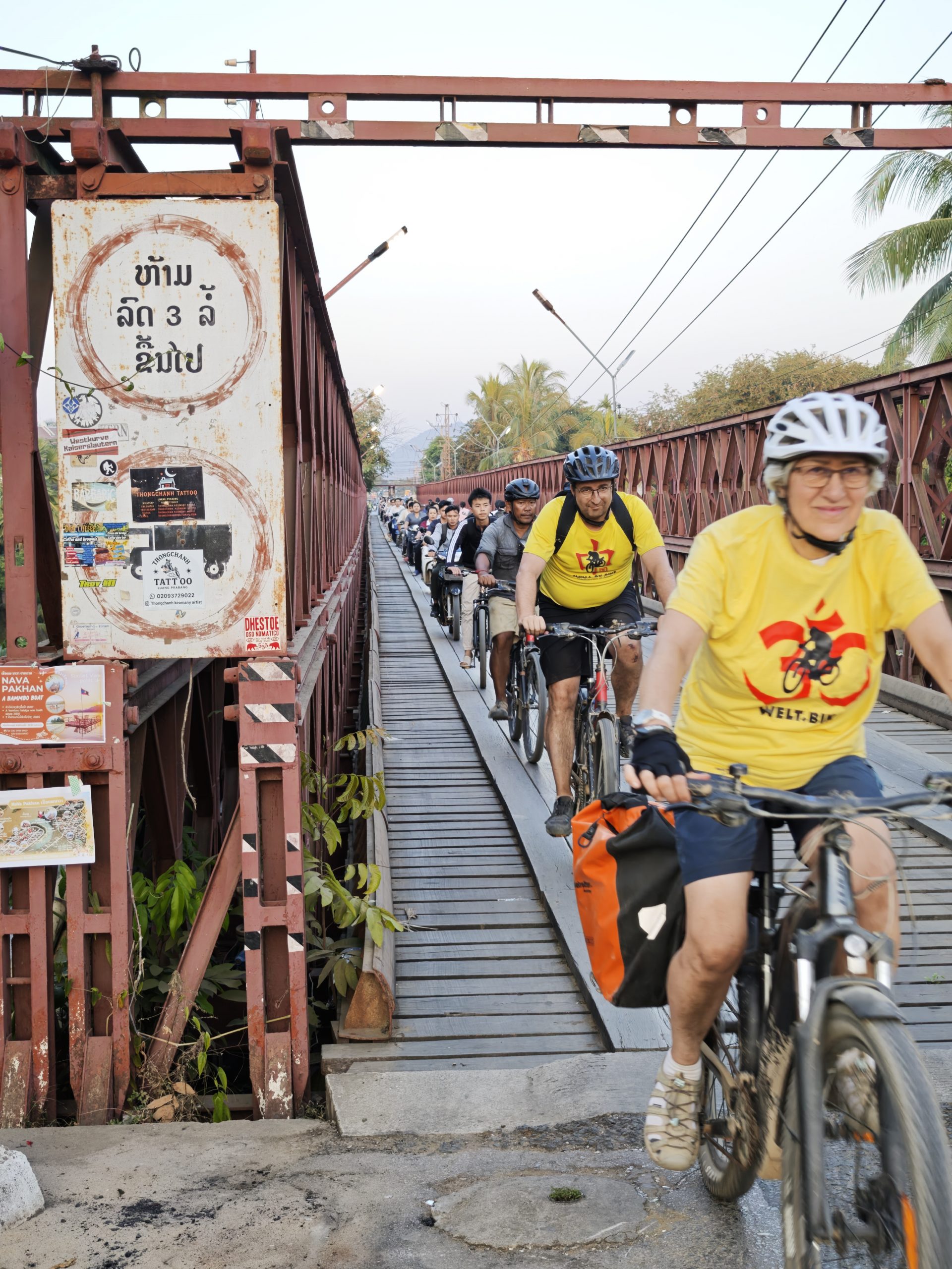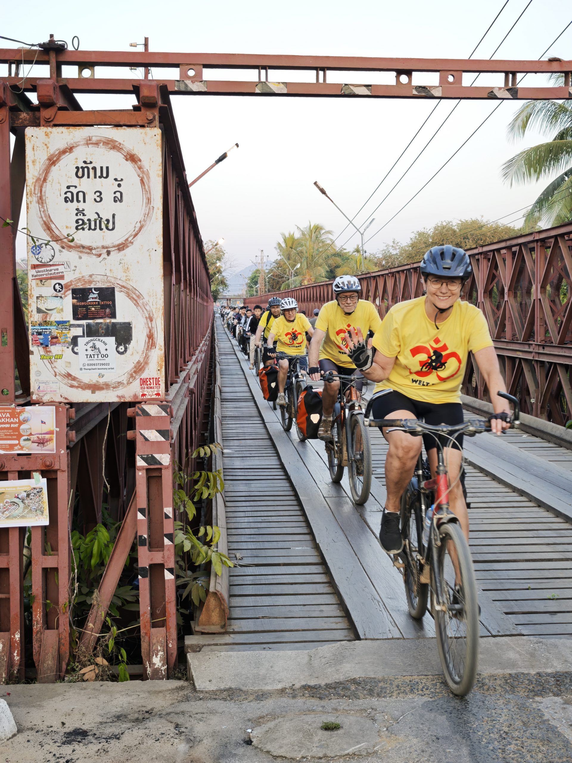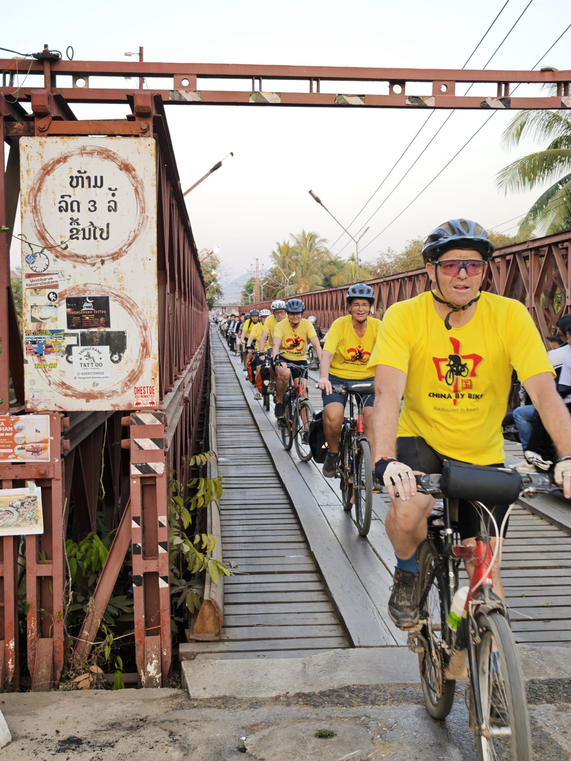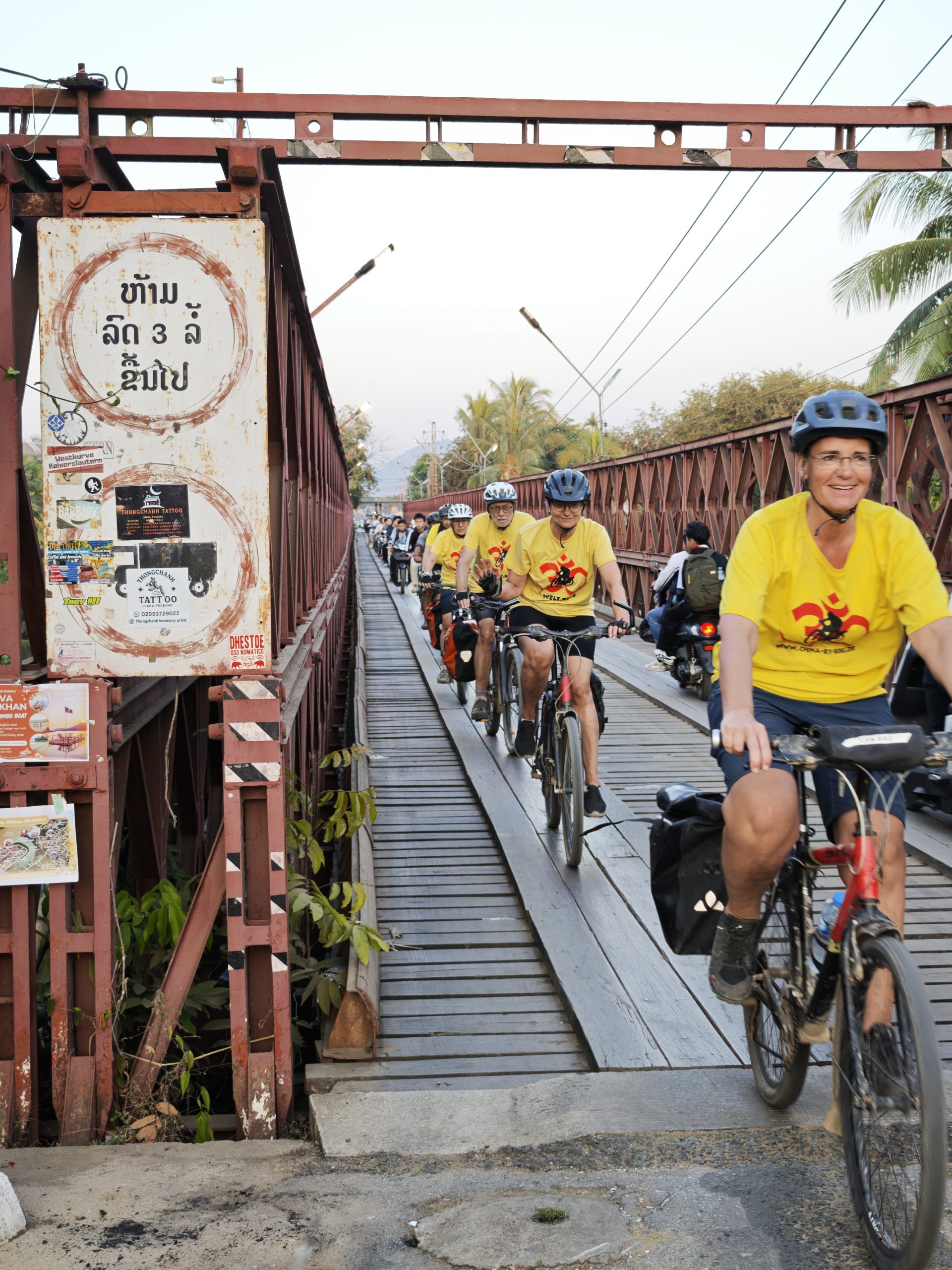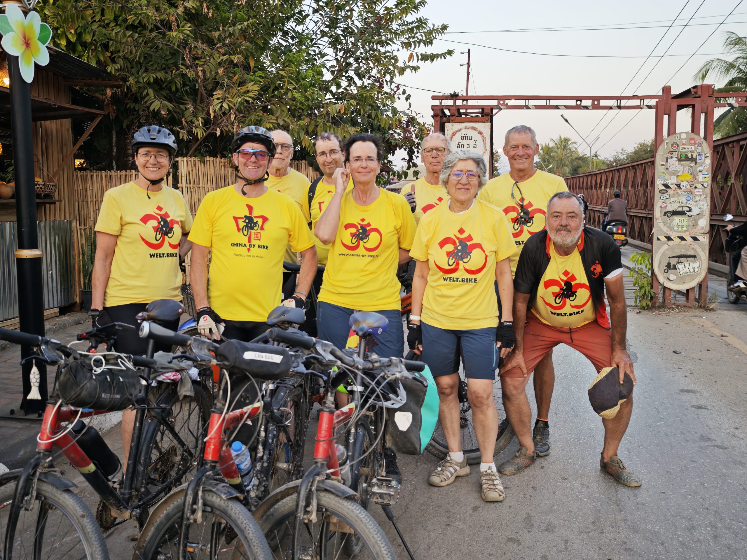 Teilweise glatter Asphalt und Traumlandschaft, teilweise Staubinferno mit LKW-Zutat. Die heutige Etappe bietet mal wieder alles auf, was man beim Radfahren in Südostasien erleben kann. Aber: Wir schaffen es pünktlich zum letzten Sonnenlicht, eben genau dies wunderbare südostasiatische Sonnenuntergangslicht, zur alten französischen Eisenbrücke über den Khon-Fluss und noch bei Tageslicht ins Hotel. Das muss mit Gruppenfotos gefeiert werden!