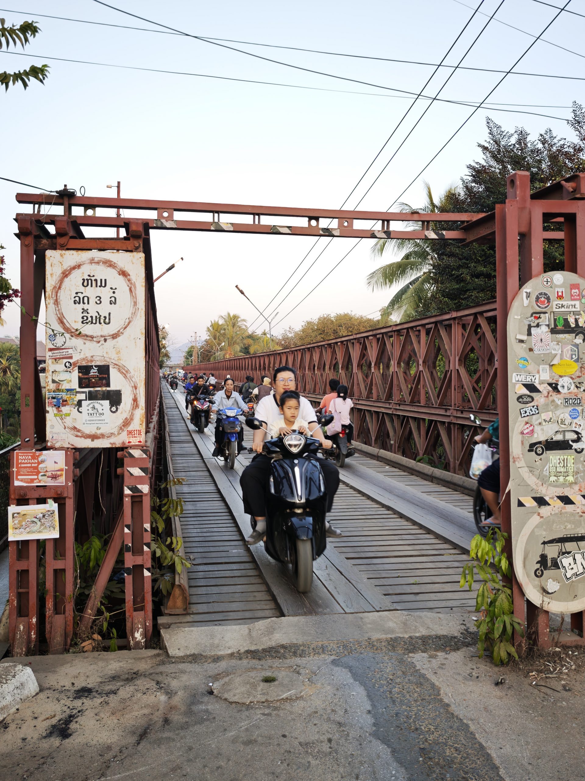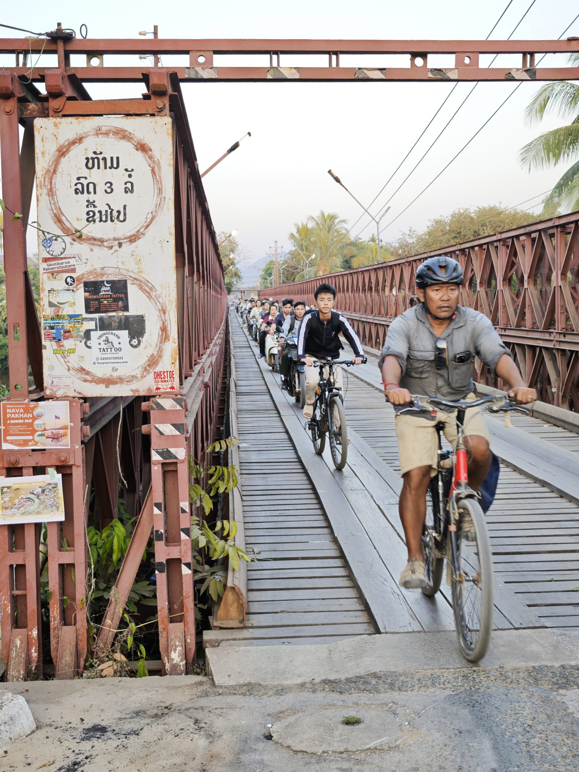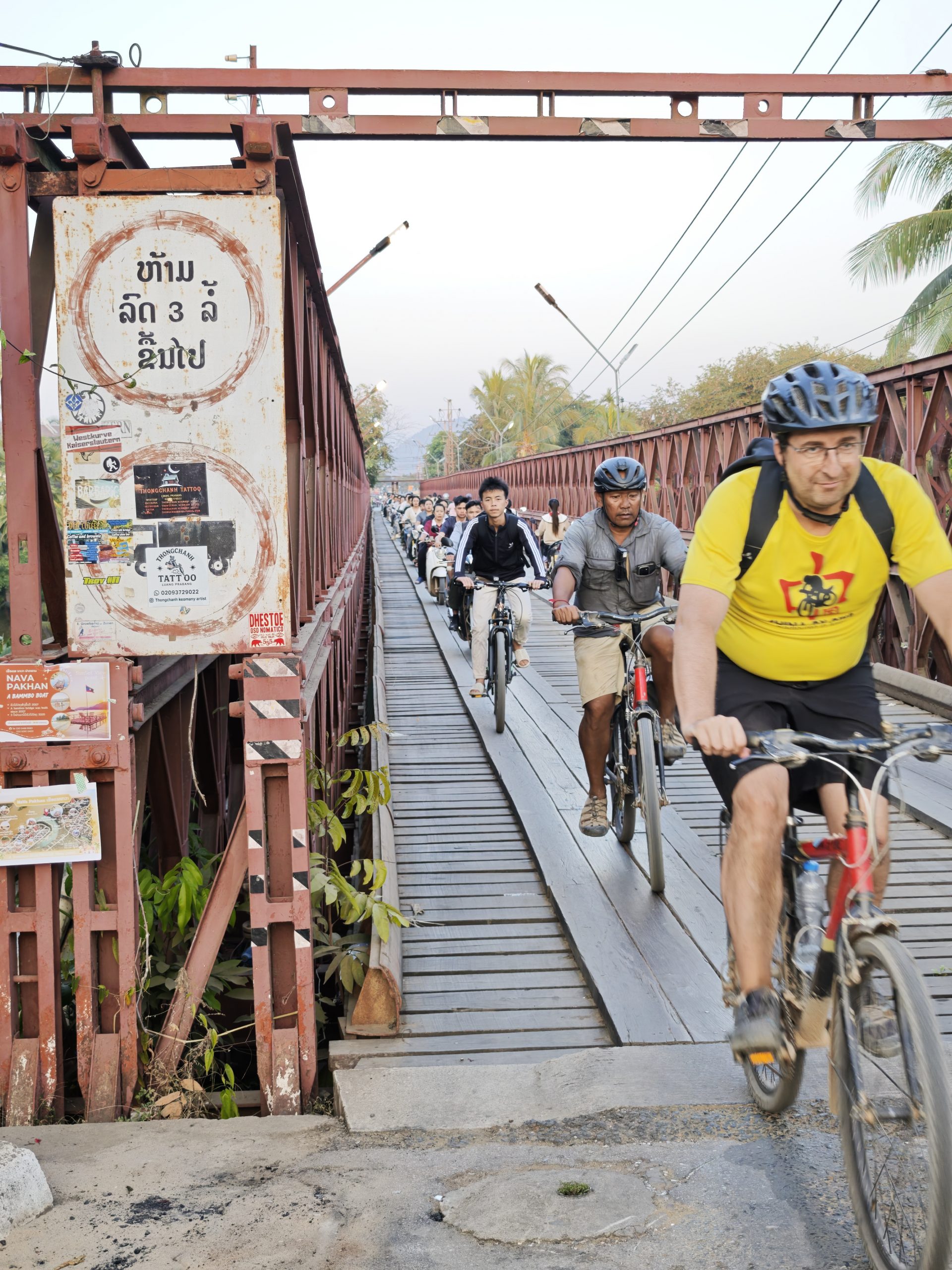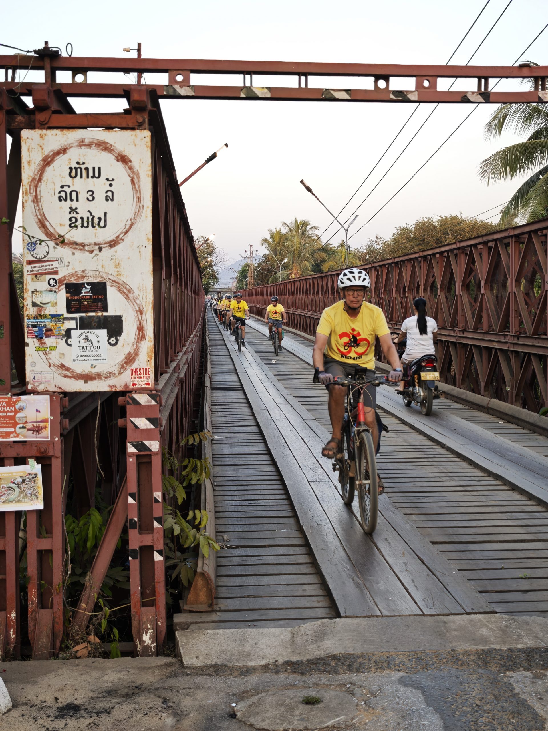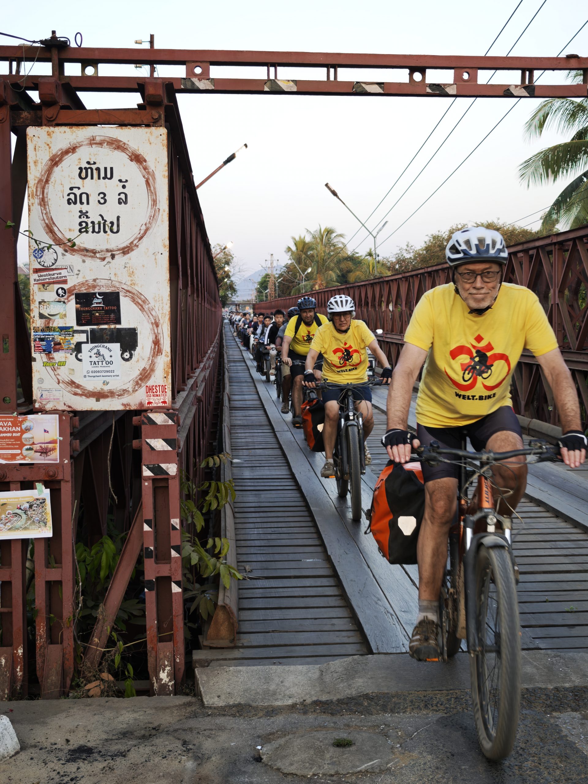 Teilweise glatter Asphalt und Traumlandschaft, teilweise Staubinferno mit LKW-Zutat. Die heutige Etappe bietet mal wieder alles auf, was man beim Radfahren in Südostasien erleben kann. Aber: Wir schaffen es pünktlich zum letzten Sonnenlicht, eben genau dies wunderbare südostasiatische Sonnenuntergangslicht, zur alten französischen Eisenbrücke über den Khon-Fluss und noch bei Tageslicht ins Hotel. Das muss mit Gruppenfotos gefeiert werden!