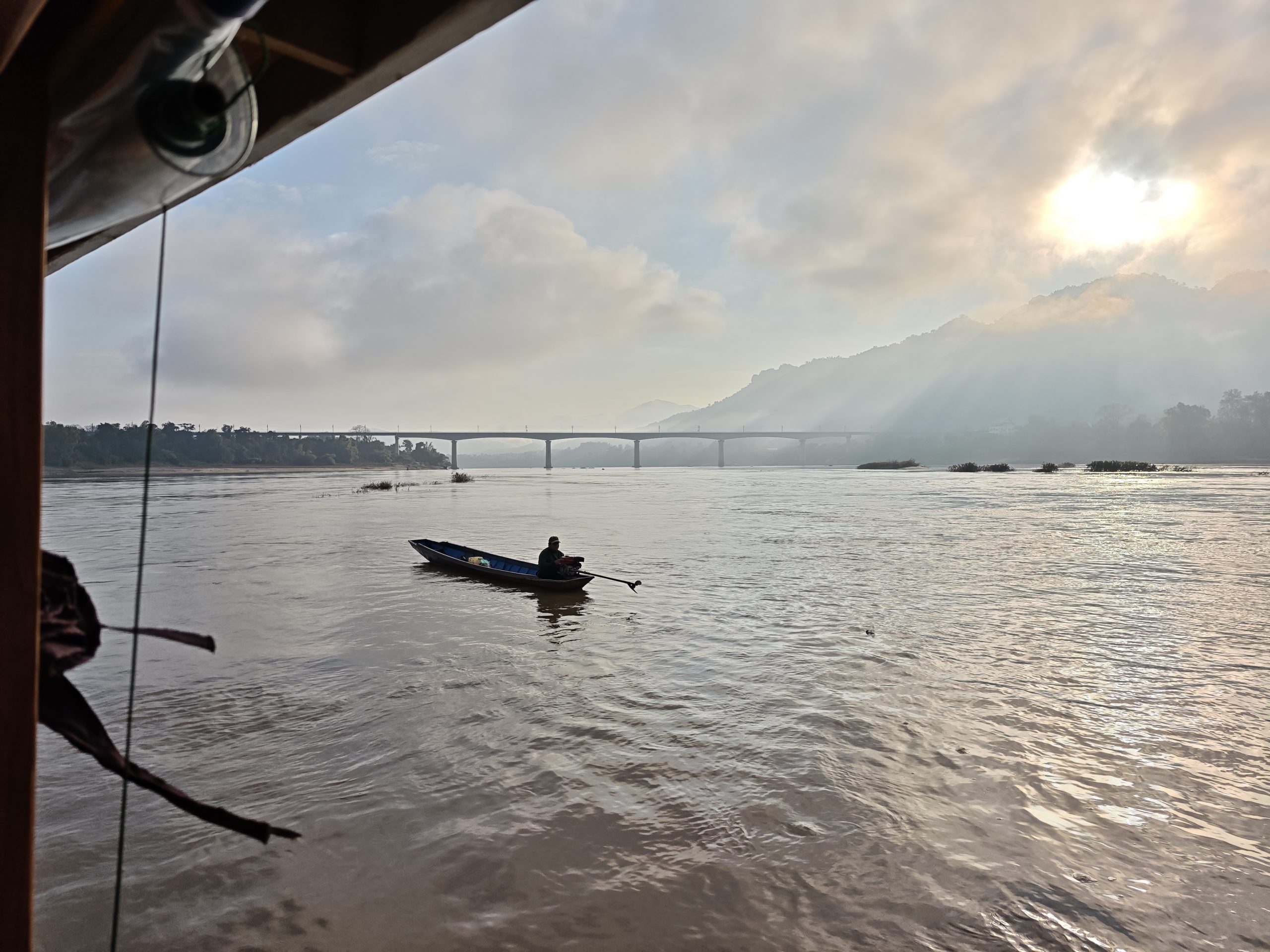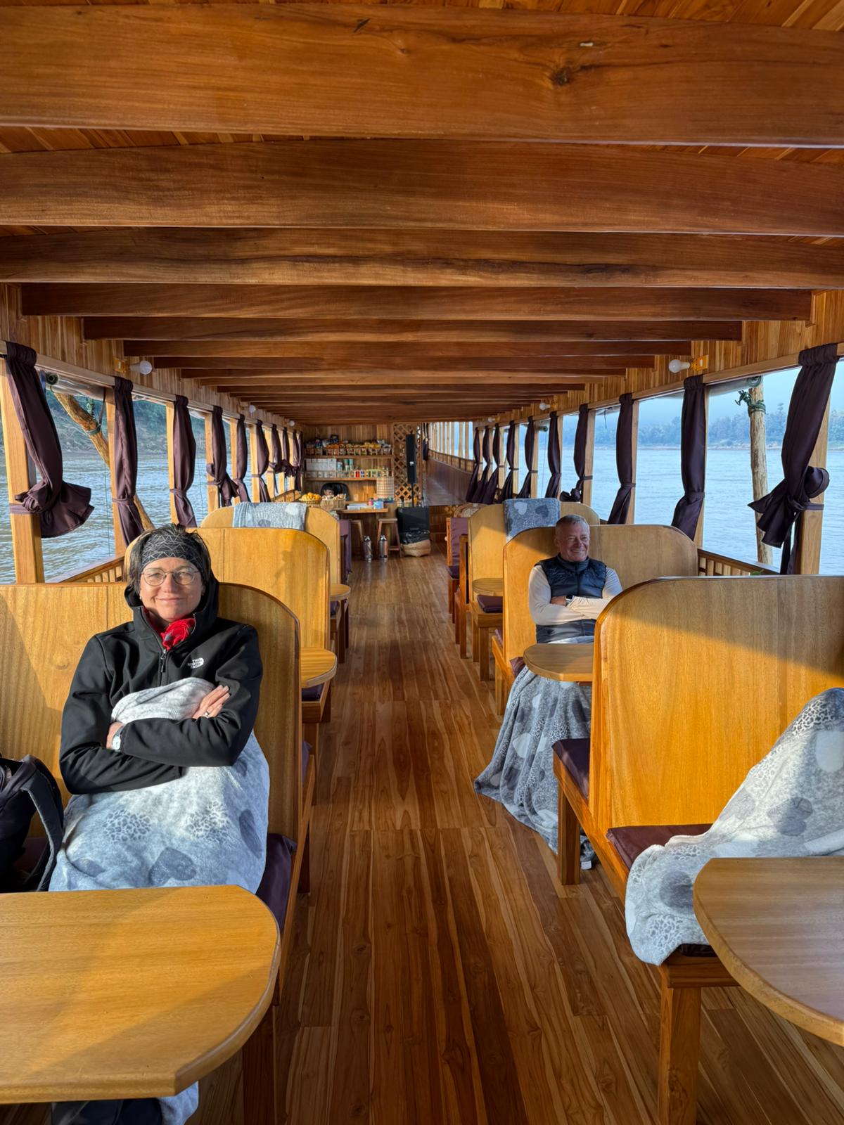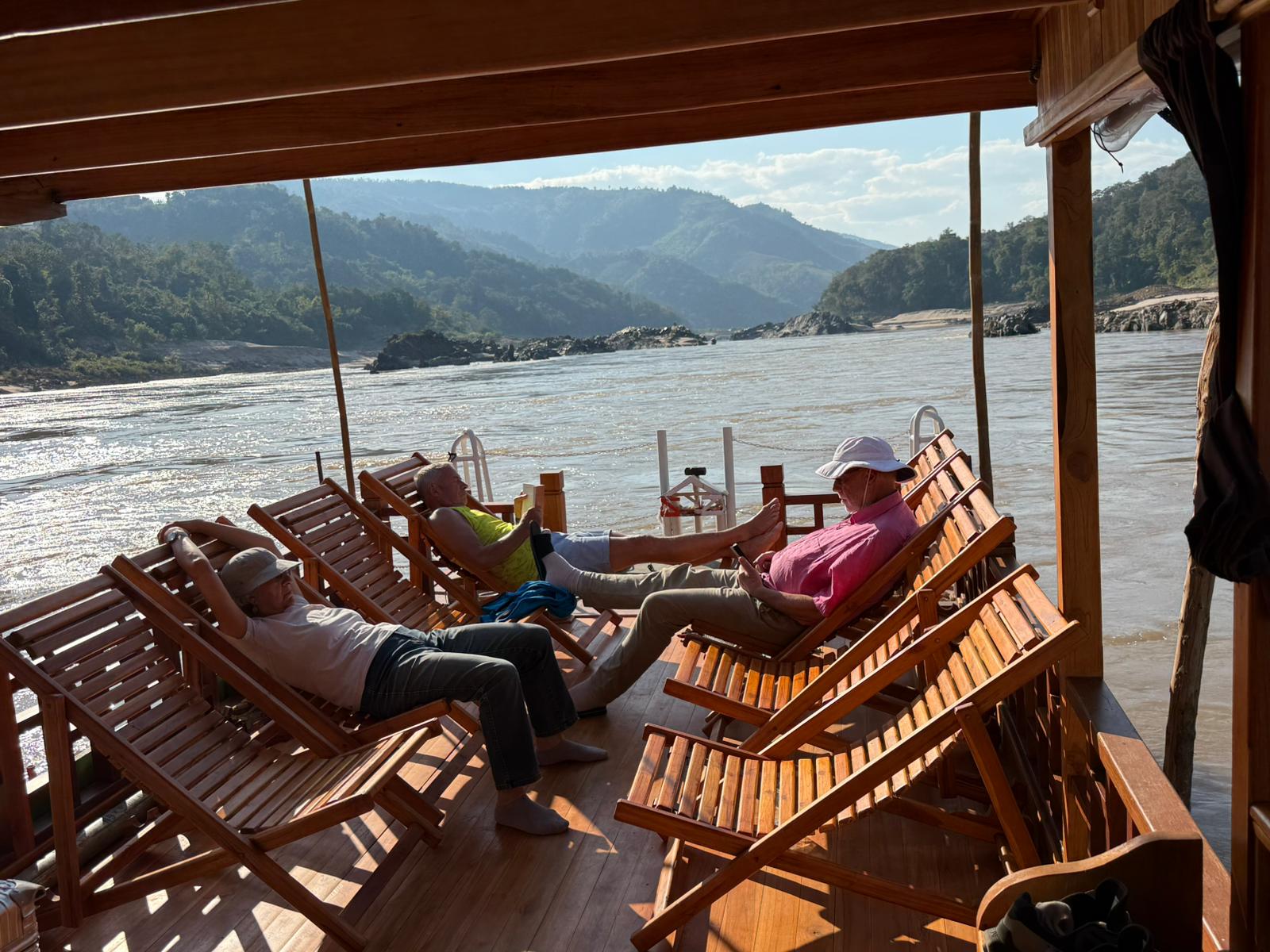 Die beiden Tage sind tiefenentspannt, wir lesen, schauen meditativ auf die dichte tropische Vegetation an beiden Ufern und erreichen Thailand am frühen Abend des zweiten Tages. Der Grenzübergang klappt reibungslos, der Transfer nach Chiang Rai auch. Nur auf der Suche nach einem Restaurant für das Abendessen müssen wir etwas weiter laufen, meine erste Wahl entpuppt sich als ziemlich abgeranzte Kneipe für die lokale Expat-Community, die zweite Wahl ist OK, wir sitzen im Biergarten und genießen die Wärme. Morgen früh geht es dann nach Bangkok!