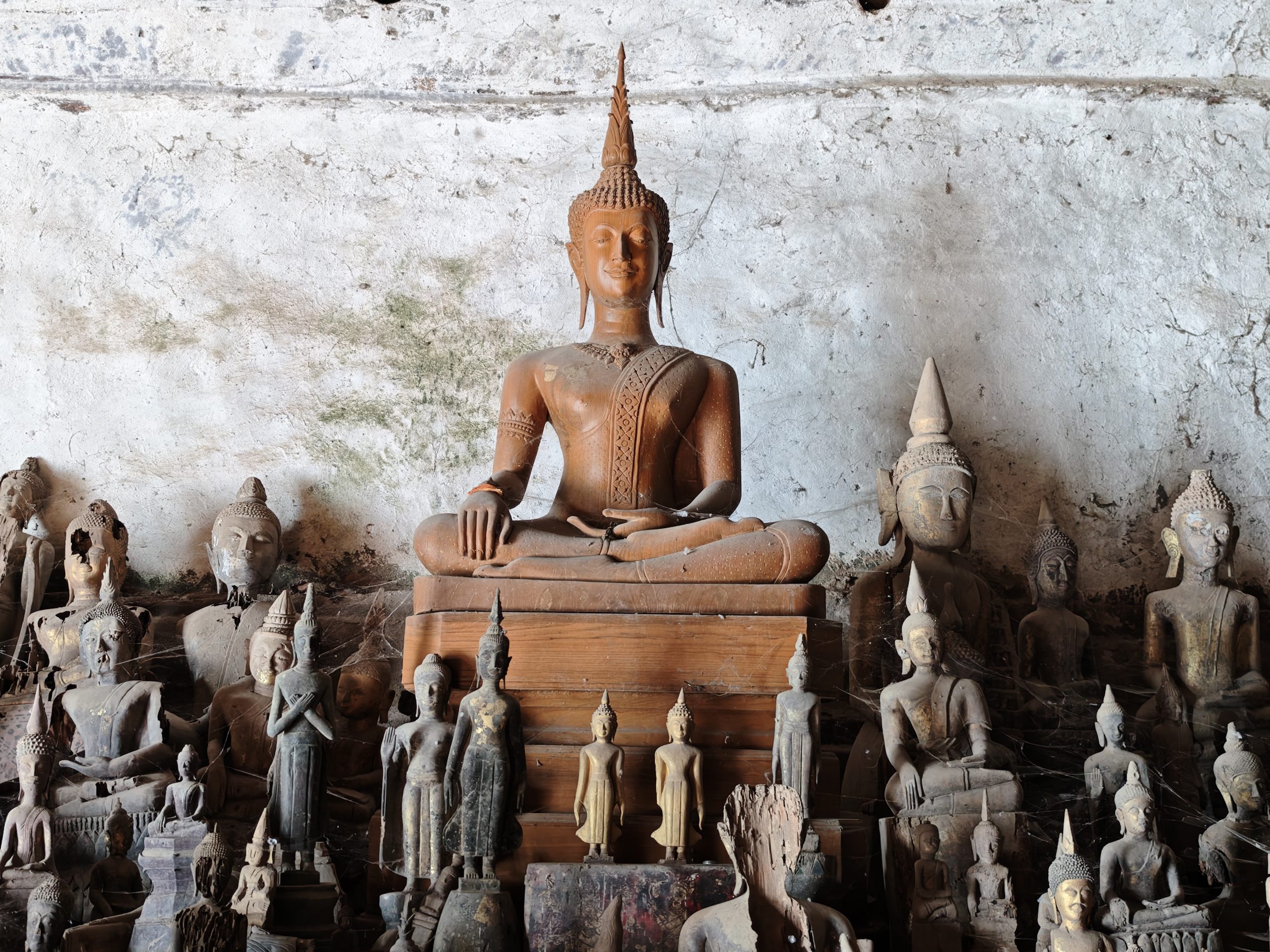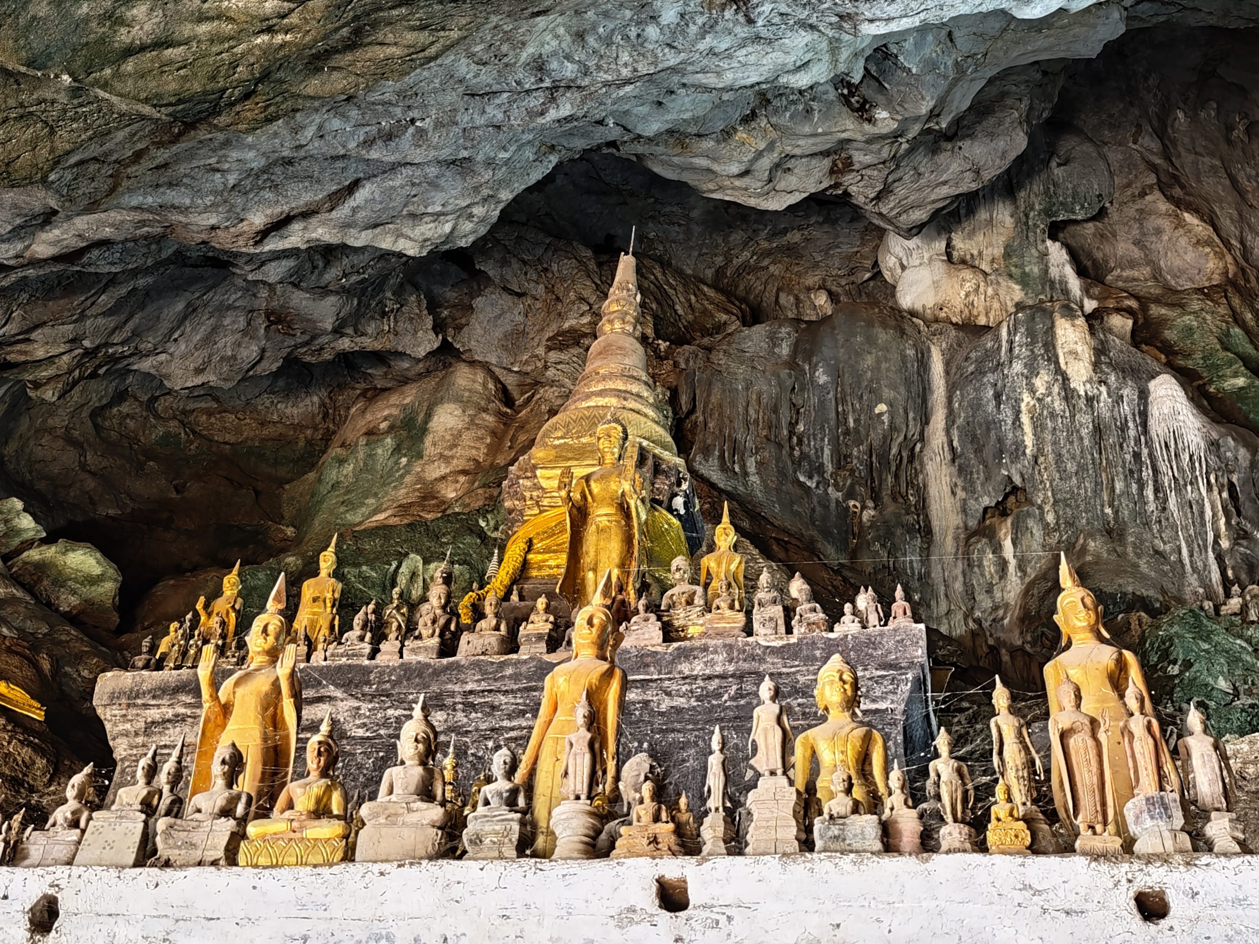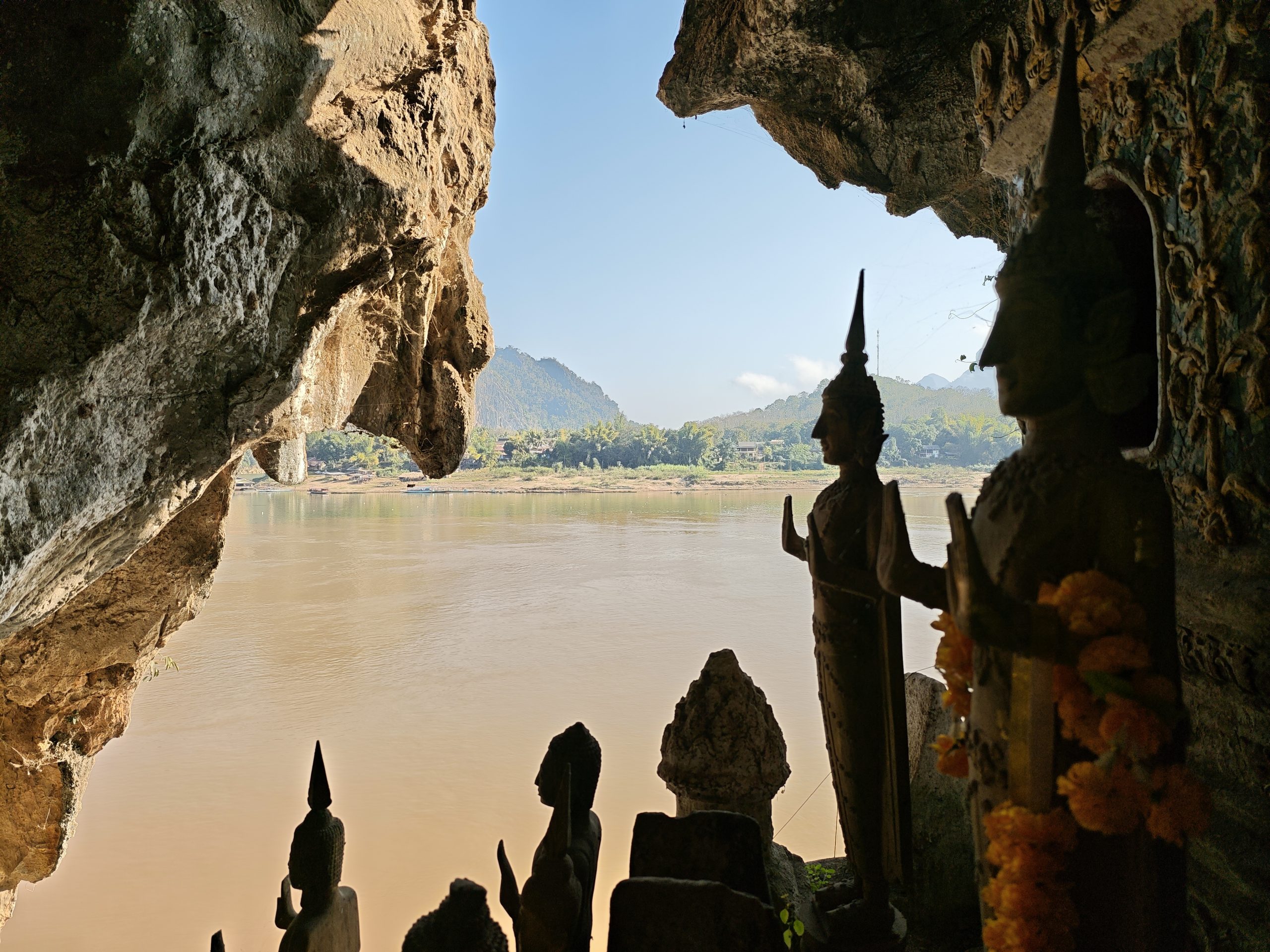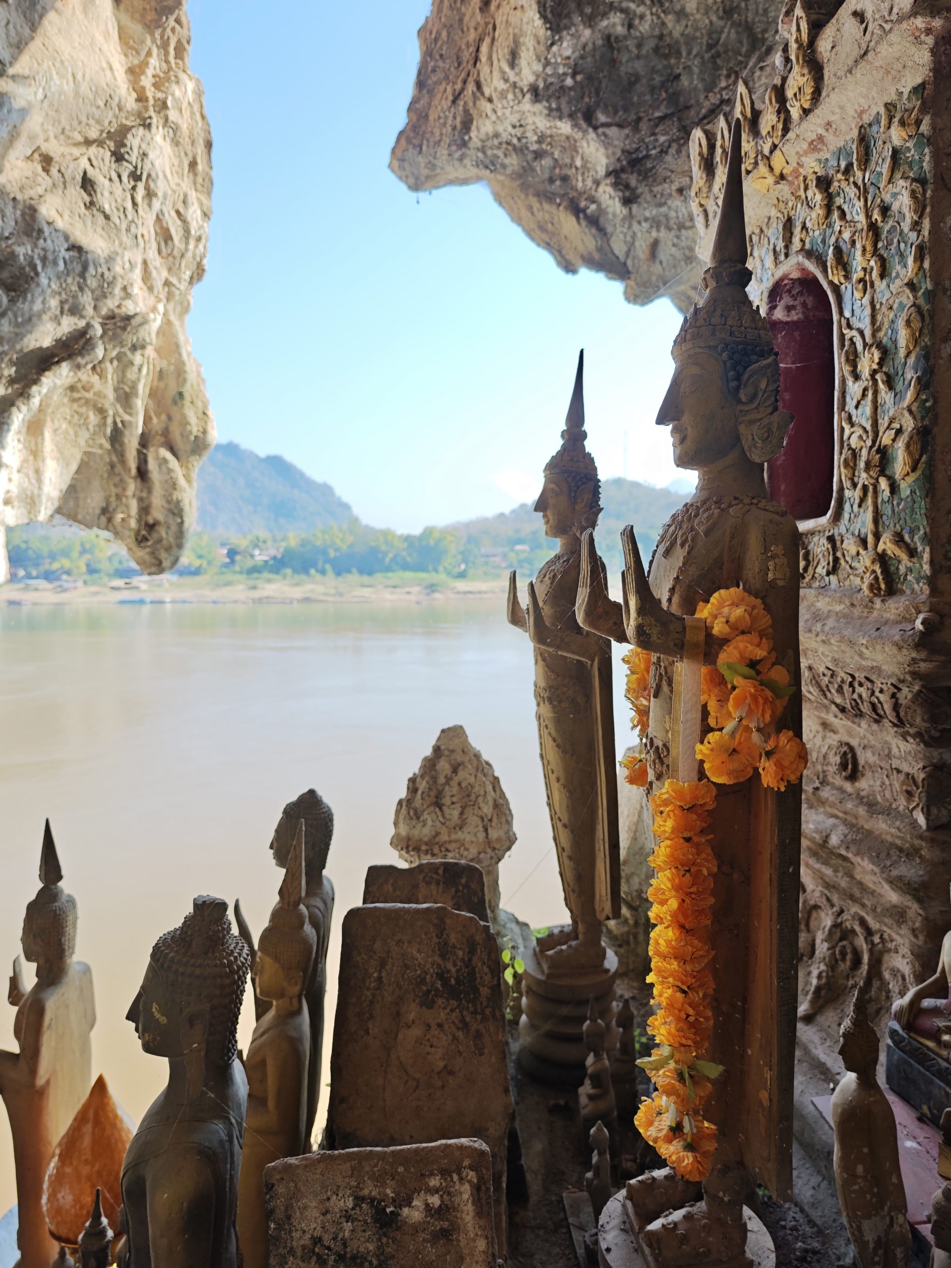 Am Morgen sagen wir Tschüß zu den Rädern und fahren mit dem Boot an zwei Tagen den Mekong flussaufwärts in Richtung Thailand. Nach zwei Stunden Fahrt machen wir Stopp bei den Buddhahöhlen von Pak Ou, ein Asylheim für Buddhafiguren aus nicht mehr existierenden Tempeln, und gleichzeitig so etwas wie ein geistiger Leuchtturm, der die Schiffer auf dem Mekong beschützt.