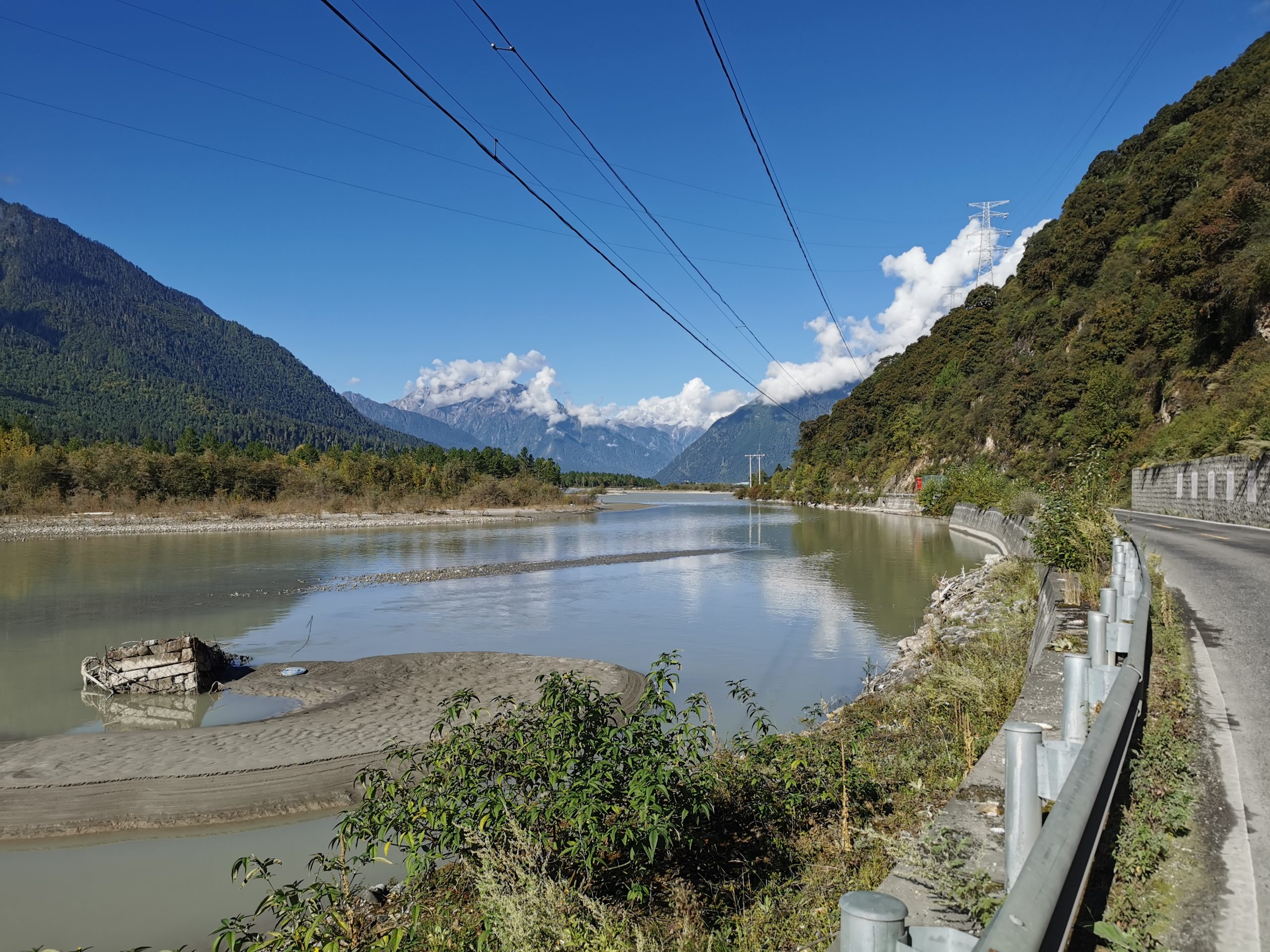 Und auch unsere Straße ist kunstvoll in das Tal geschlagen, in dem der Parlong Zangbo rasant ins Tal rauscht. Auch wir lassen rollen und genießen das herrliche Spätsommerwetter. Nur der Baustellenverkehr, schwer beladene Laster mit Sand, stört.