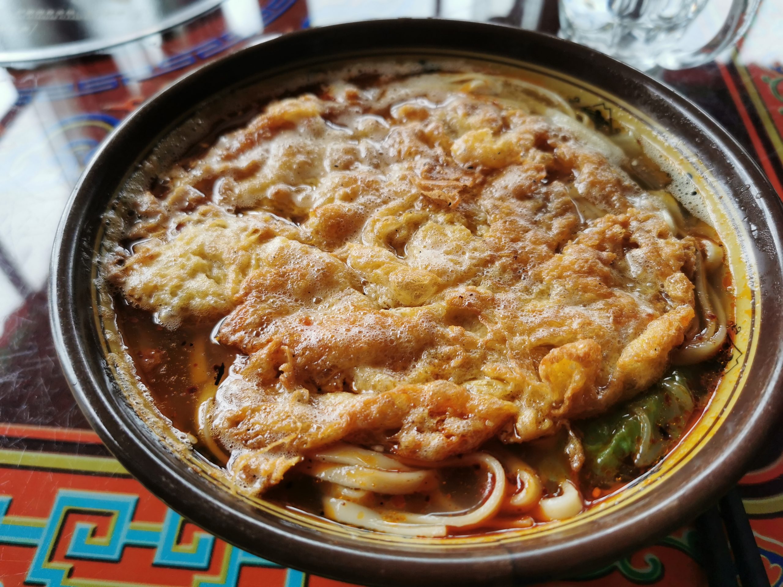 Glücklicherweise erwartet uns am Fuß der Abfahrt eine tibetischen Nudelbude, die Sonne kommt für einen Moment heraus, wir trocknen, schlürfen ausgezeichnete Suppe und gehen frohen Mutes auf die letzten 48 Kilometer. 280 Höhenmeter nur noch bis Mangkang, unserem Zielort, das sollte doch auf einer Arschbacke…