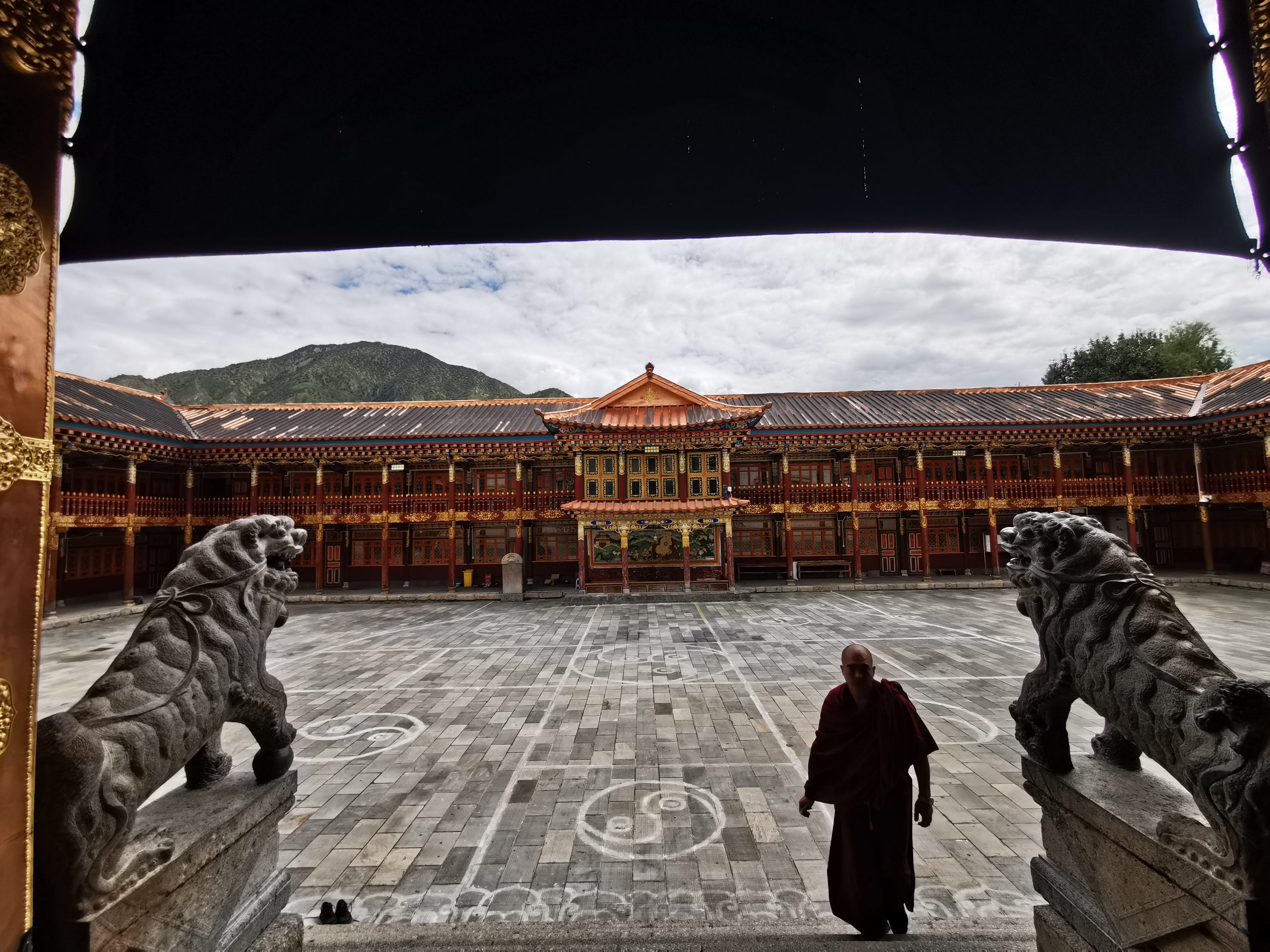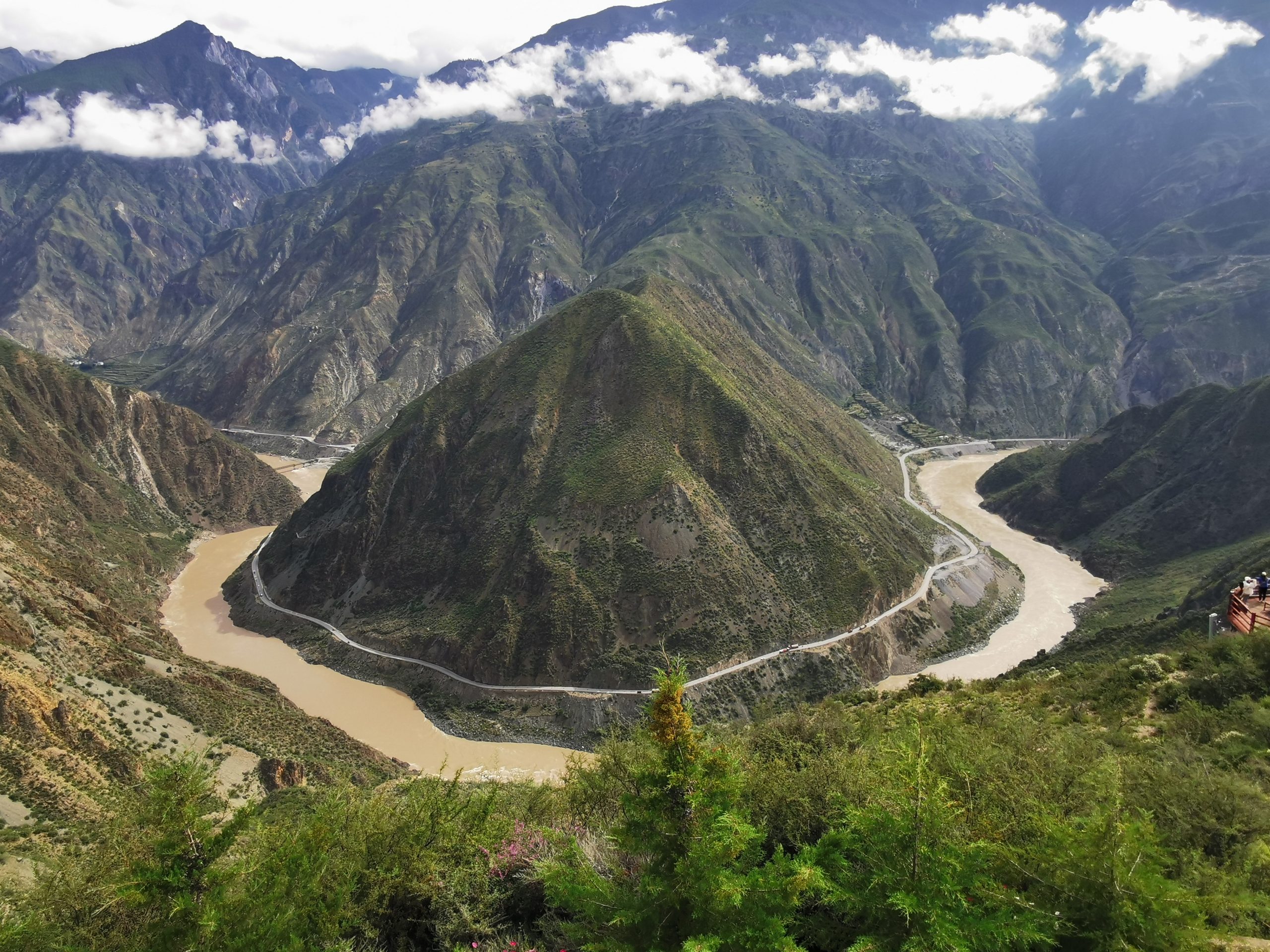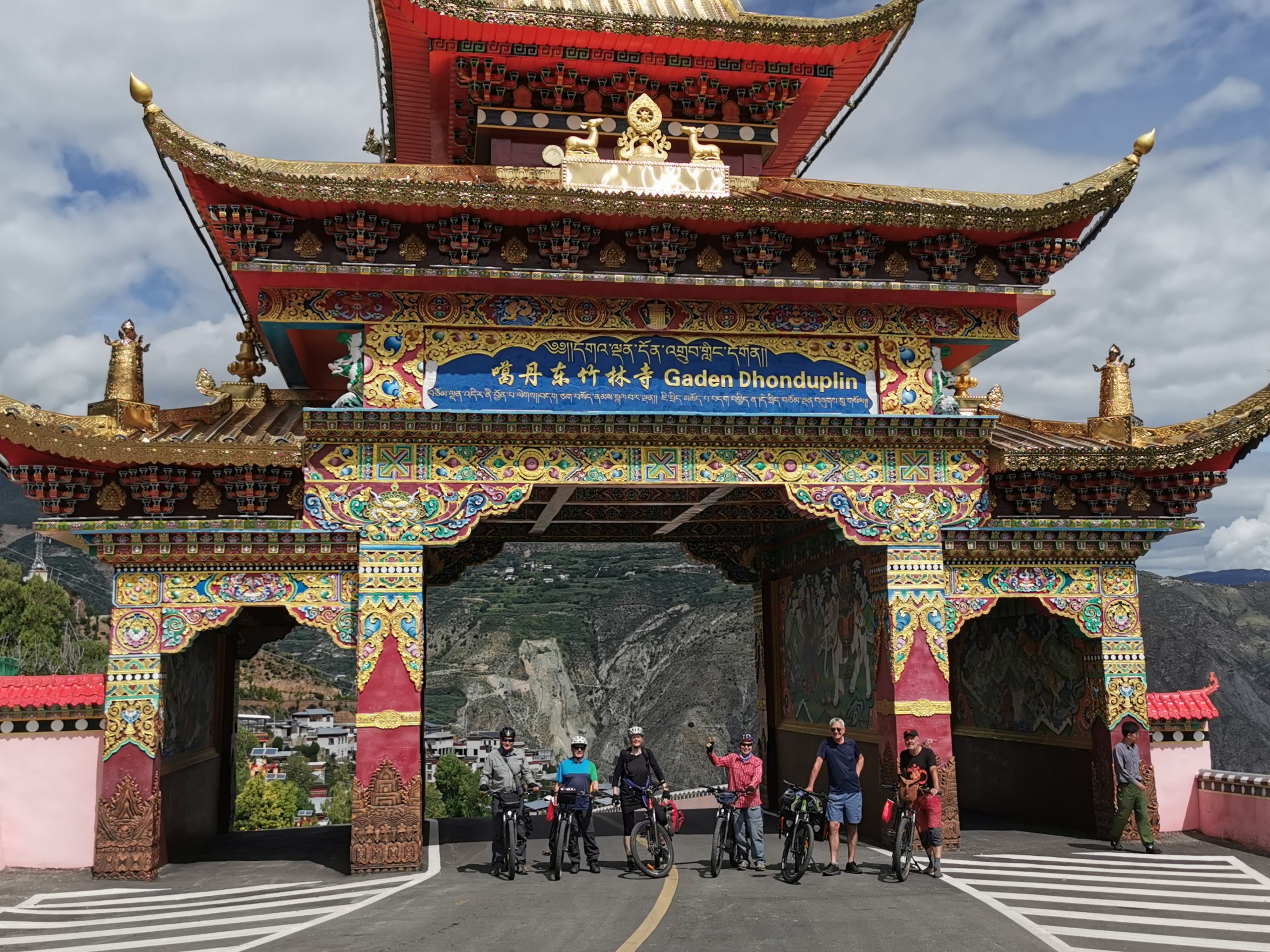 Der Tag beginnt mit einem typischen tibetischen Frühstück: Yakbuttertee, Tsampa und allerlei Drumherum. Und da, wo möglich, keine ranzige Yakbutter für den Tee benutzt wird, schmeckt der Tee auch äußerst lecker, weckt und wärmt. Nicht, dass es nötig wäre, den ganzen Tag radeln wir bei sommerlichen Temperaturen, fast ausschließlich bergauf, insgesamt gut 1.200 Höhenmeter. Mit elektrischer Unterstützung ist das tatsächlich ein Heidenspaß. Die Aussicht auf die erste Biegung des Yangzi (ehemals die erste, erste, weil in Shigu, 200 Kilometer flussabwärts schon lange eine „erste Biegung des Yangzi gefeiert wird) ist atemberaubend, der Baima Snow Mountain hüllt sich allerdings in Wolkenwatte. Wir besichtigen das Dongzhulin-Kloster, das als Kleinod am Yangzihang klebt und erreichen am späten Nachmittag unsere kleine, etwas in die Jahre gekommene Unterkunft.